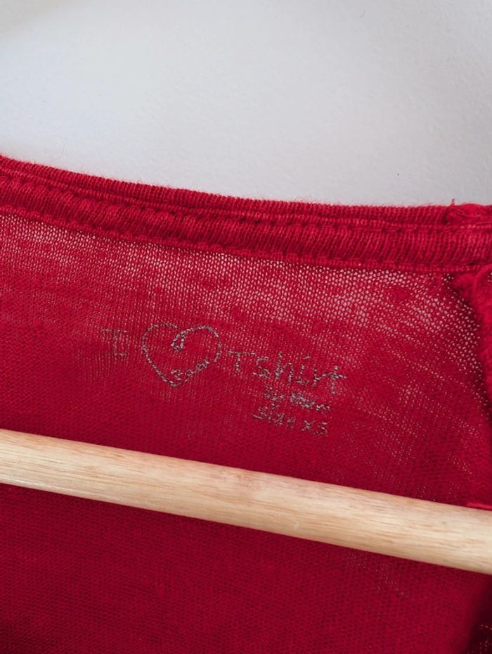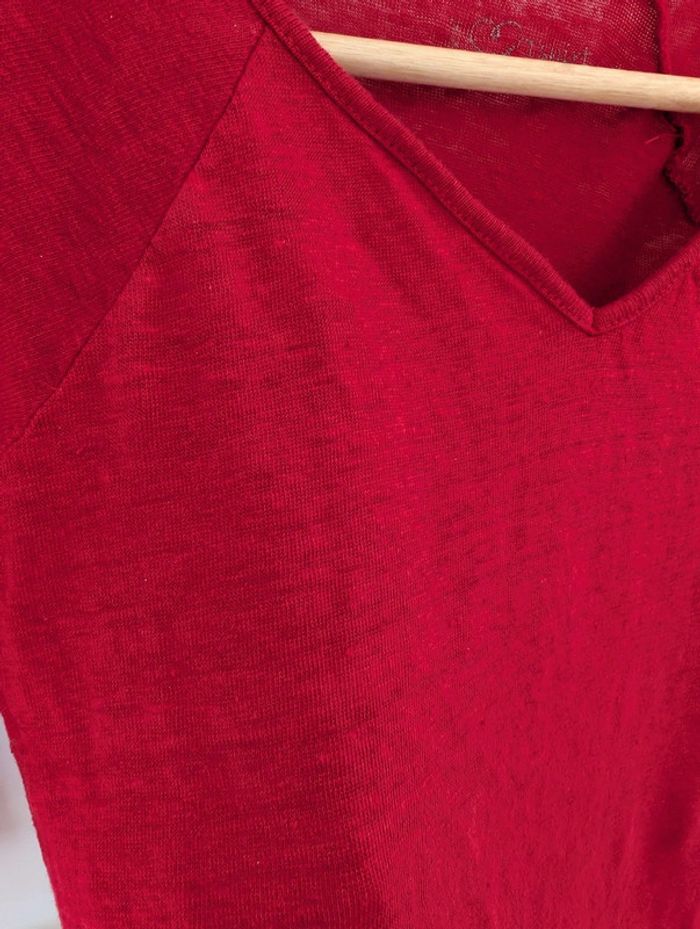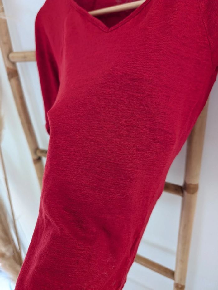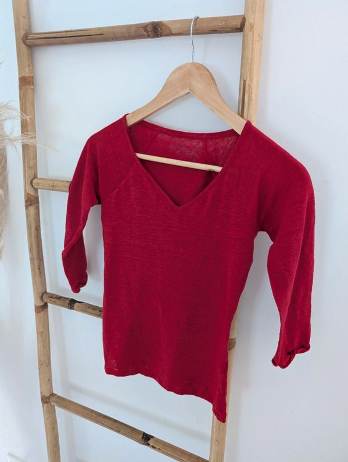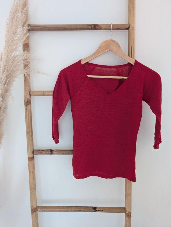 Top tissu type pull très fin manches 3/4 rouge. Marque : je ne sais plus mais je pense Etam Taille XS État satisfaisant déjà porté bouloches d'usure comme en photos. #tennytebvetementsfemme