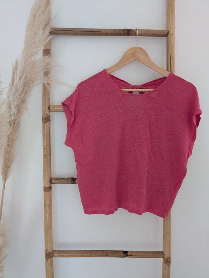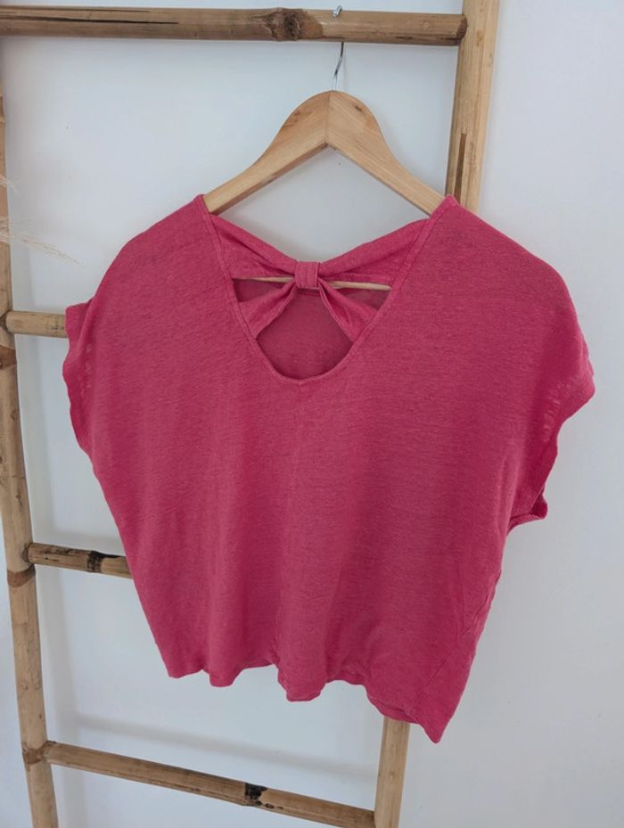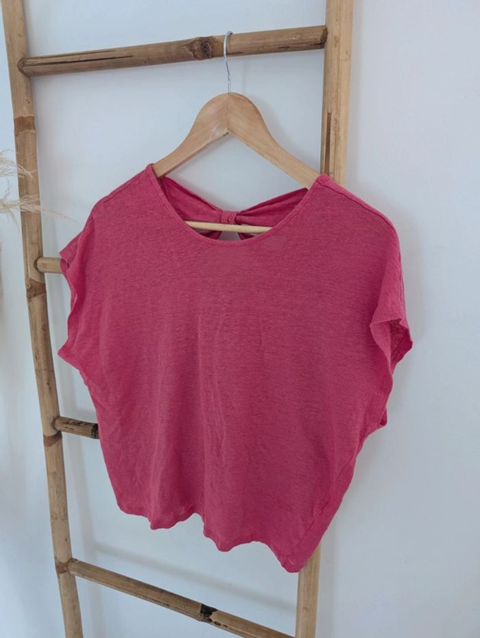 Top large rose avec nœud haut du dos. Marque Naf Naf (il n'y a plus d'étiquette). Taille S. État satisfaisant déjà porté petites bouloches d'usure visibles en photos. #tennytebvetementsfemme #nafnaf