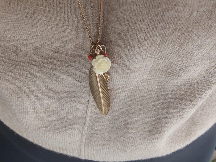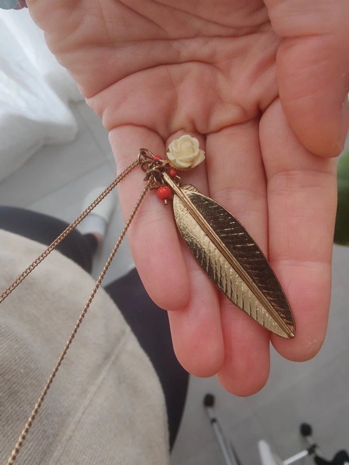 Sautoir doré plume et fleurs Style boho *Bon état car le doré a un peu terni #earthy #earthygirl #bohostyle #boho #plume #sautoirboheme