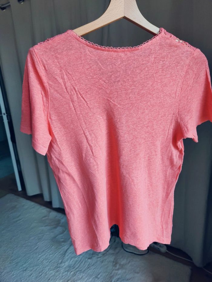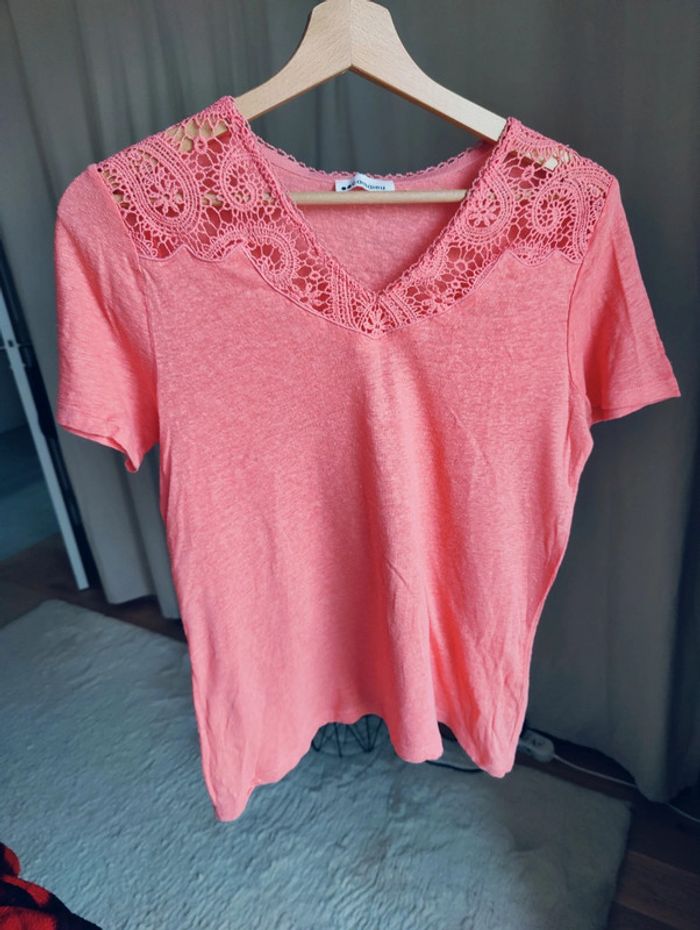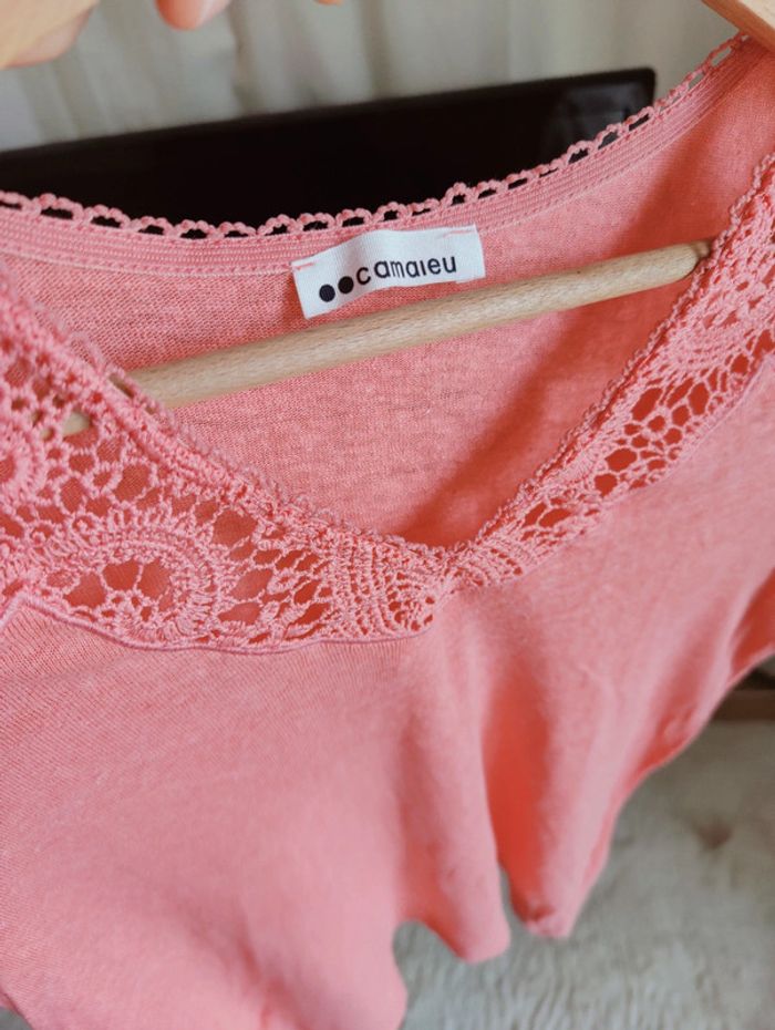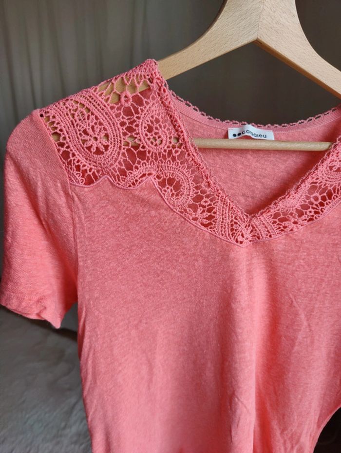 🌸 Joli T-shirt Camaïeu avec dentelle sur le décolleté et les épaules Il est en viscose et lin (* je vends le même en rose) En très bon état