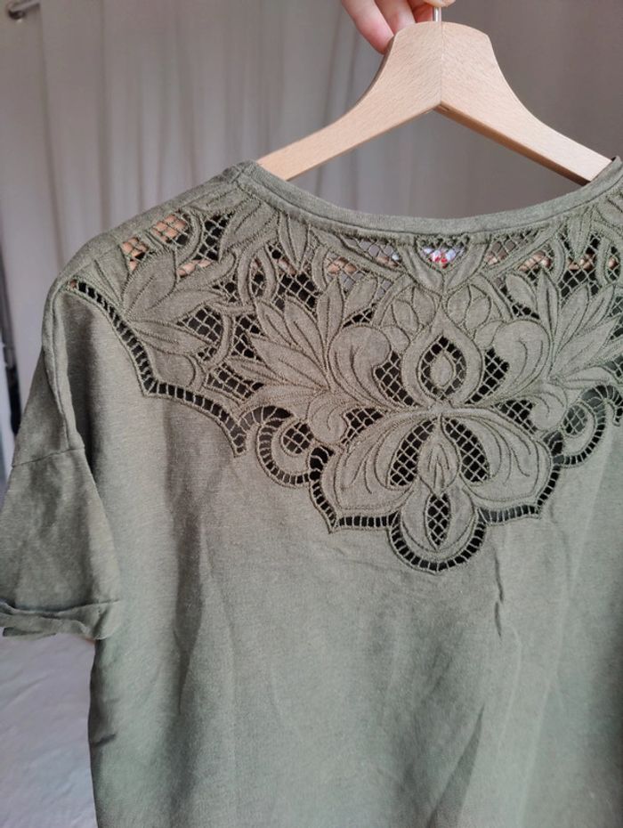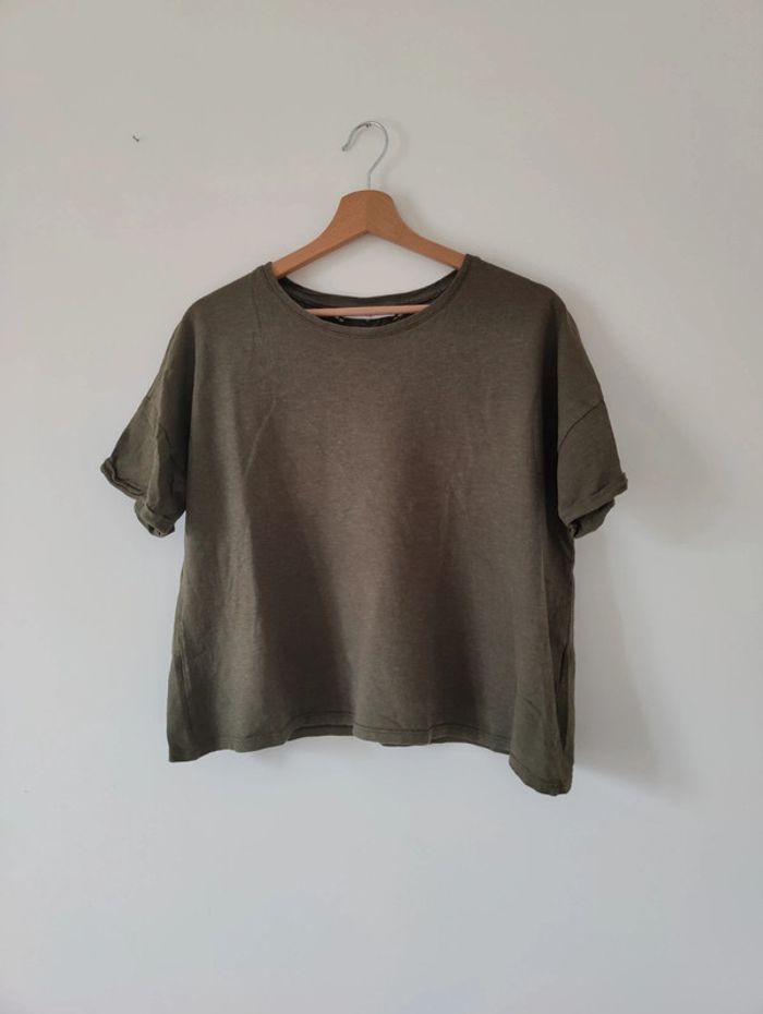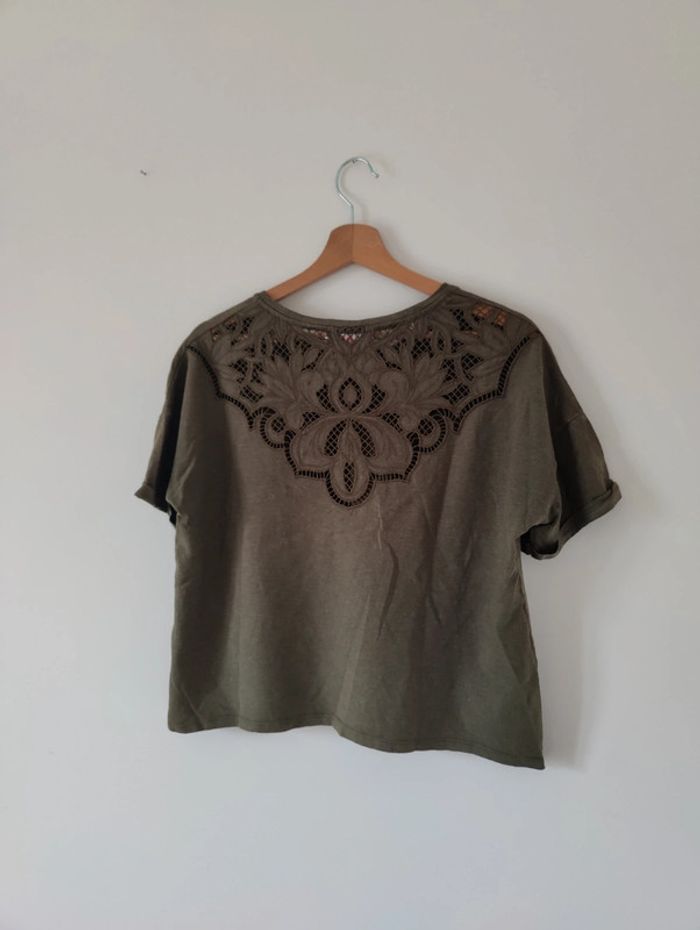 Joli T-shirt kaki en coton et lin de chez Camaïeu avec dentelle sur le dos Manches courtes retroussées En très bon état Taille M