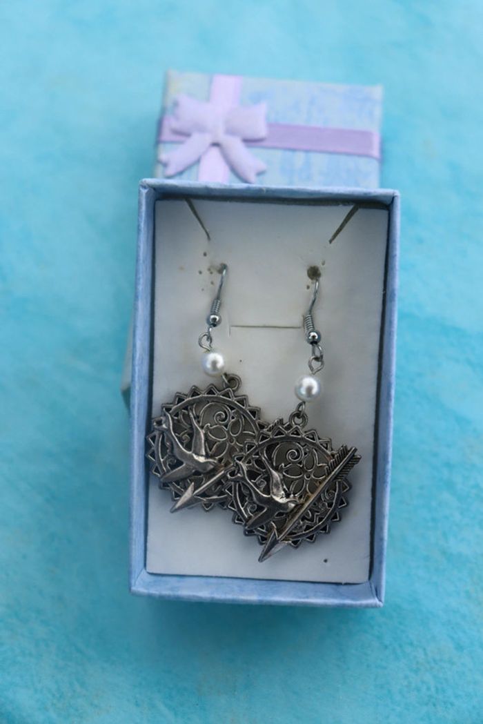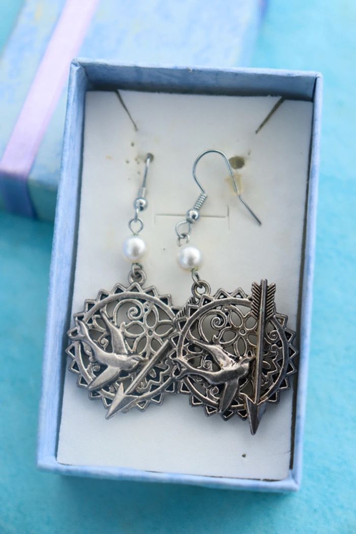 Boucles d'oreilles oiseau et flèche, inspirées d'Hunger Games. Presque jamais portées. Elles sont dans leur boîte d'origine. Les lots sont ouverts jusqu'à -50 % sur mon dressing alors n'hésitez pas 😉. #bouclesdoreilles #bouclesdoreillesfantaisie #bouclesdoreilleshungergames #hungergames #bouclesdoreillespendantes #bouclesdoreillesargentées #bouclesdoreillesgeaiemoqueur