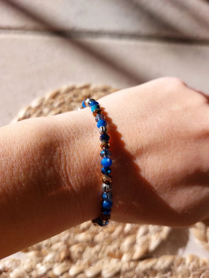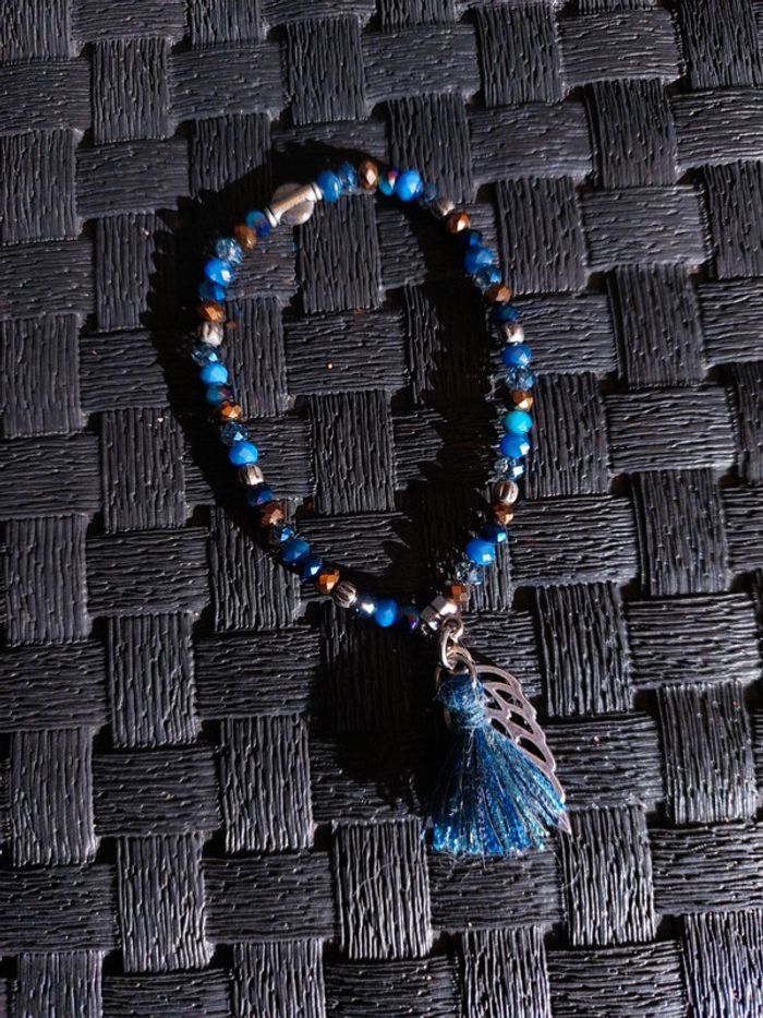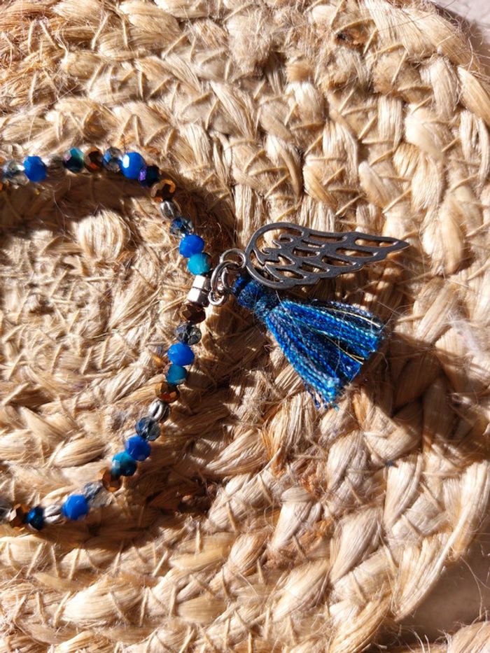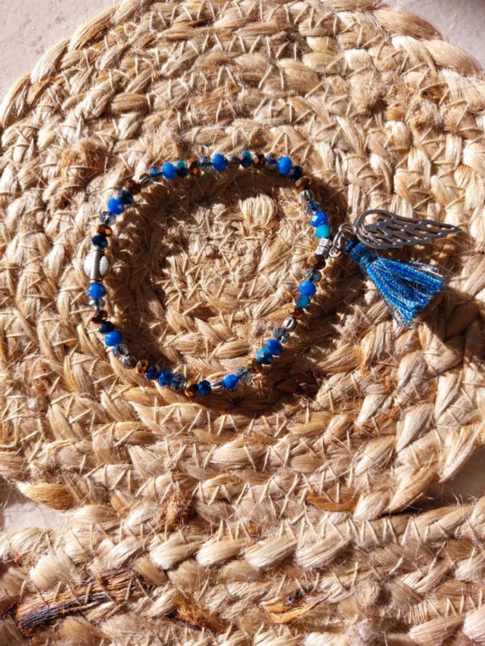 Bracelet en perles bleues, avec pendant aile et petit pompon. Élastique (j'ai un poignet d'enfant). Porté une fois, comme neuf. Acheté dans une boutique indépendante. Les lots sont ouverts jusqu'à -50 % sur mon dressing alors n'hésitez pas 😉. #braceletfemmebleu #braceletperles #braceletailedange #braceletboutiqueindependante #braceletfantaisiefemme