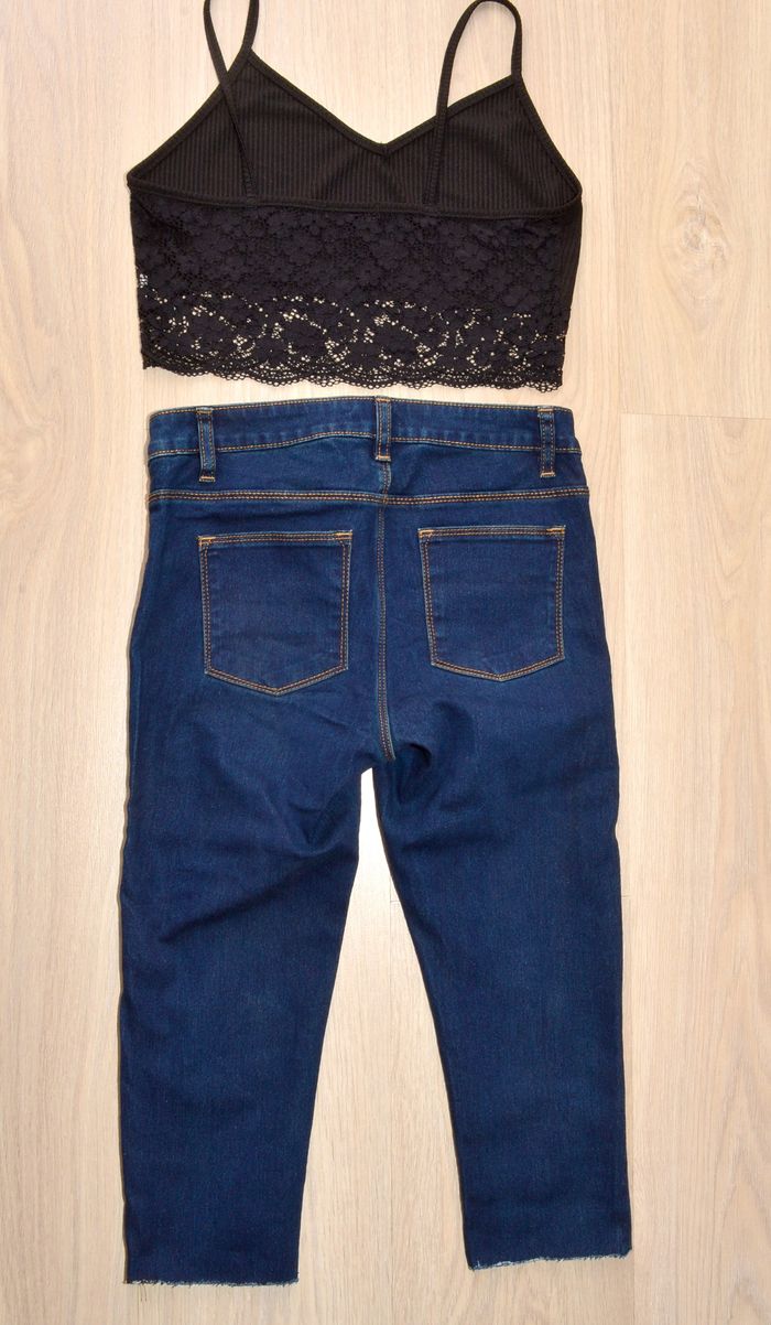 pantacourt jean bleu marine uni taille 34 taille basse taille 36 indiqué, convient à un 34 mensuration à la taille: 34,5 cm hanche 35,5 cm entre jambe 24 cm cuisse 20,5 cm longueur 63,5cm largeur du bas 13,5 cm poches et passant ceinture
