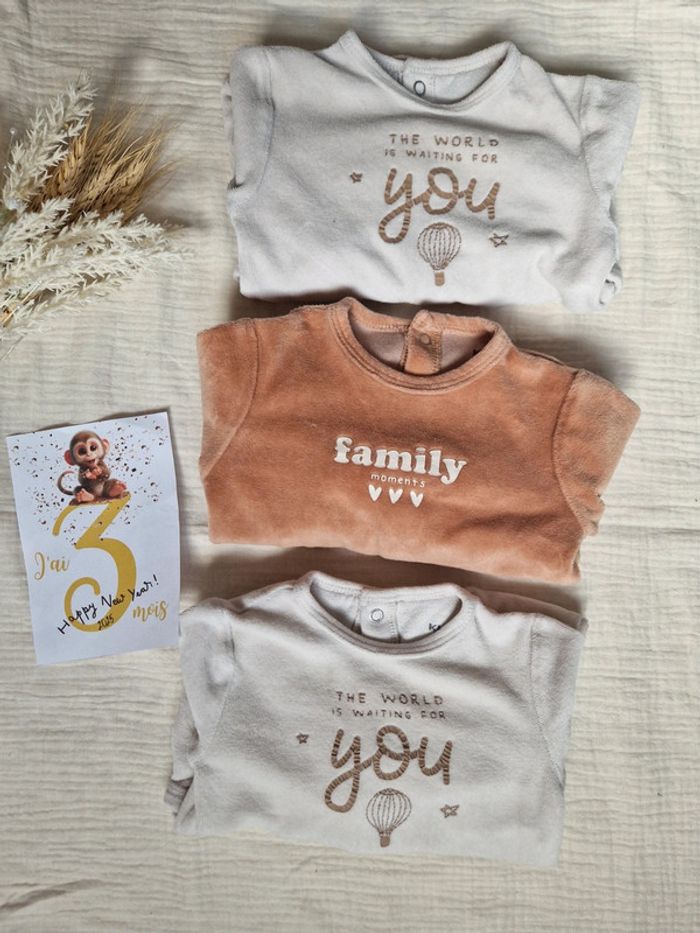 3 pyjamas 2 identiques mis quelques fois et 1 marron mis 1 fois. Mixte Ils sont en très bon état, juste l'écriture des 2 beige qui ce craque. Dressing trié par taille et type d’article. Retrouvez tout sur mon profil via le lien. C'est ici pour tout le 3 mois : #bebe3moisjh49