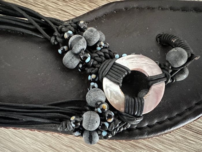 lanières noires, anneau nacré et perles bleues, semelles cordes marrons.
