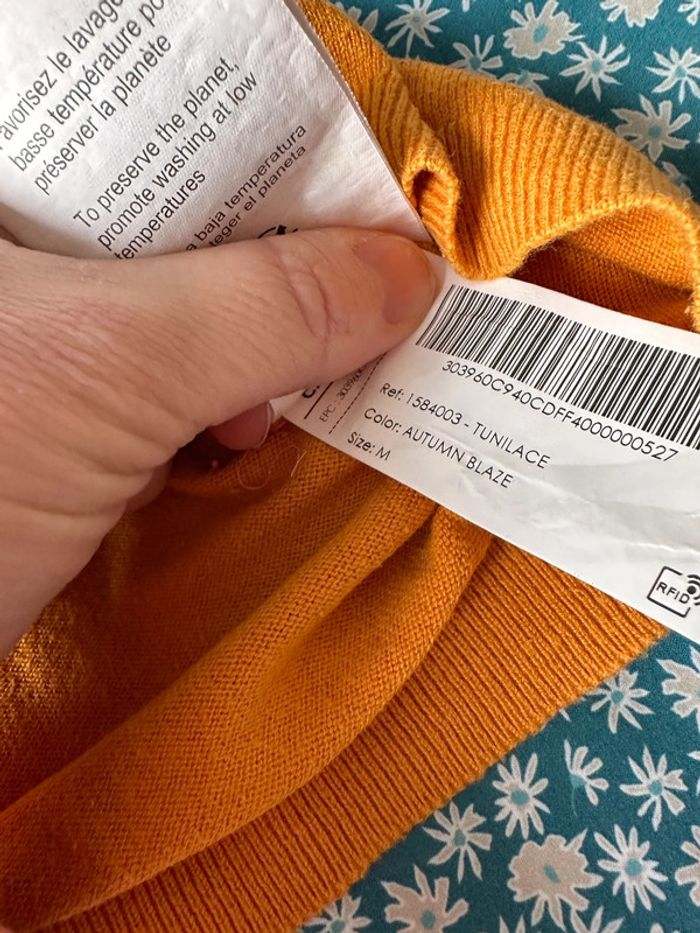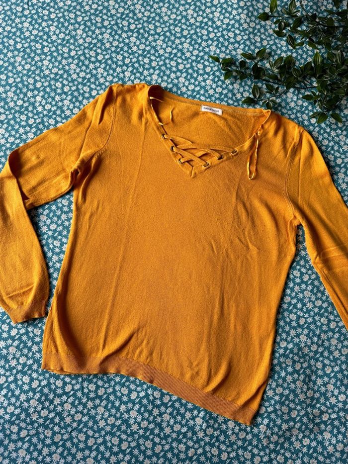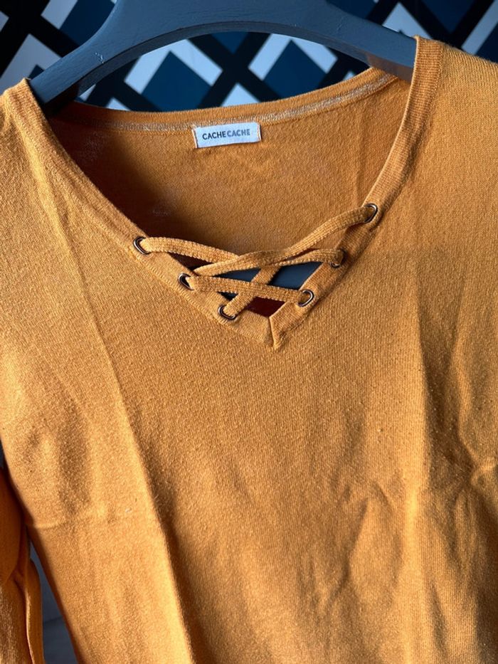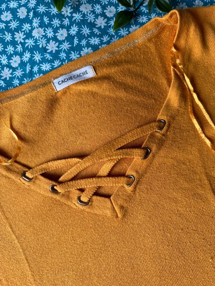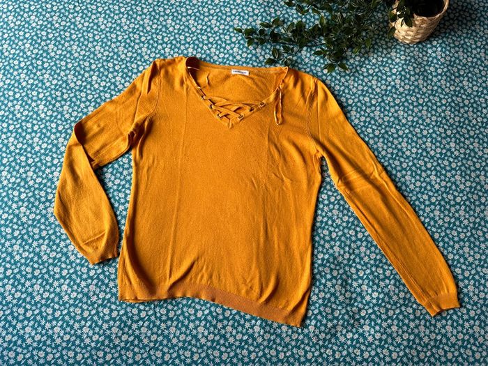 Pull fin coloris moutarde Col V avec petits détails Marque : cache cache Taille : 38 #femme38_latilma
