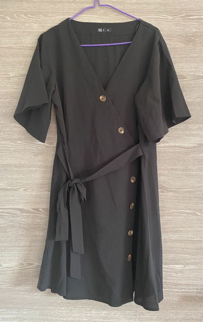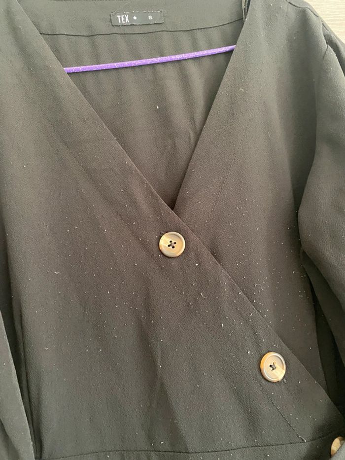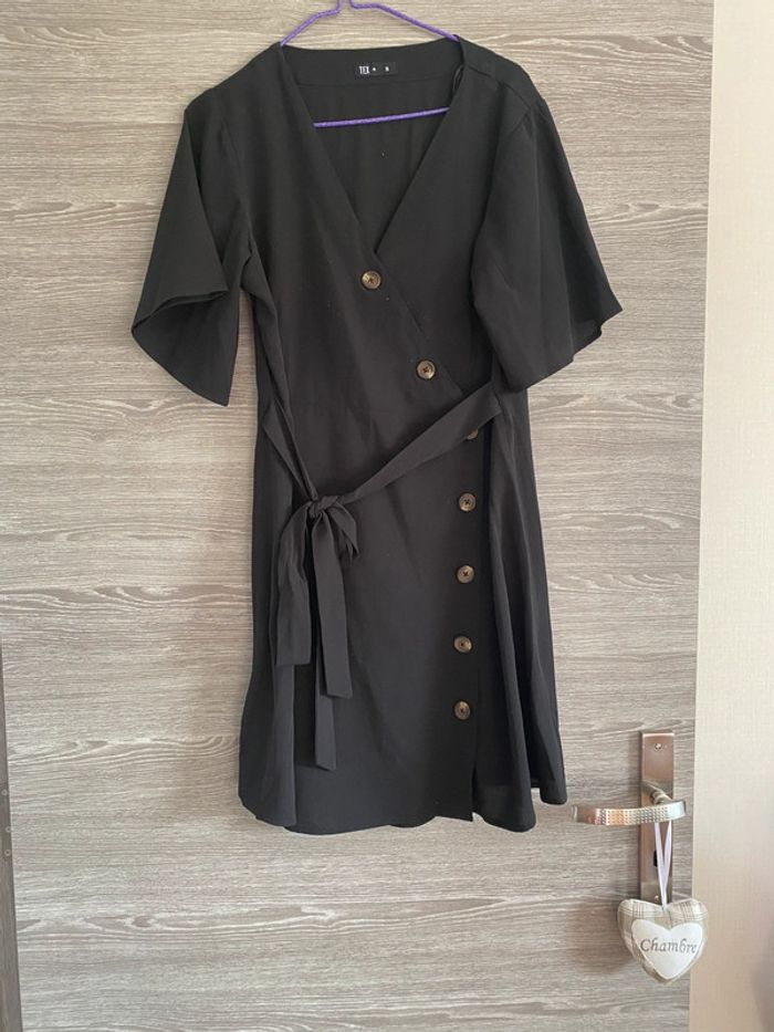Robe cache cœur. Robe croisé avec boutons Coloris noire petite ceinture à nouer Marque : tex Taille : 36 38 Bon état petites bouloches sur le devant voir photo #femme36_latilma