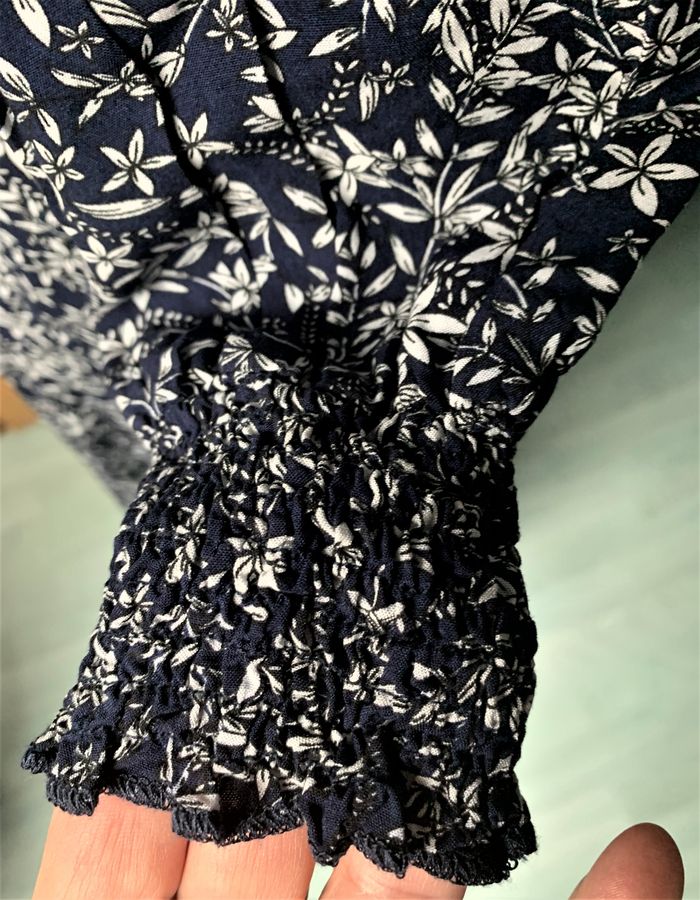 Boutons déco sur la poitrine, poignets smockés, 2 grandes fentes de chaque côté., fermeture zip dos. Tour de poitrine 94 cm, tour de taille 78 cm, longueur 134 cm. Matière fluide 65% polyester 35% coton.