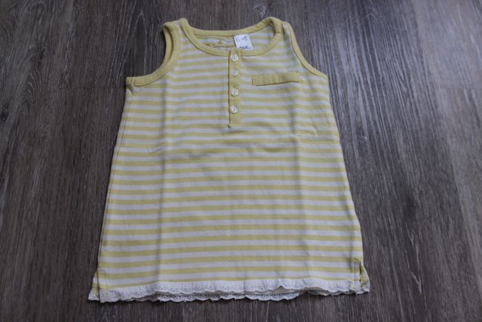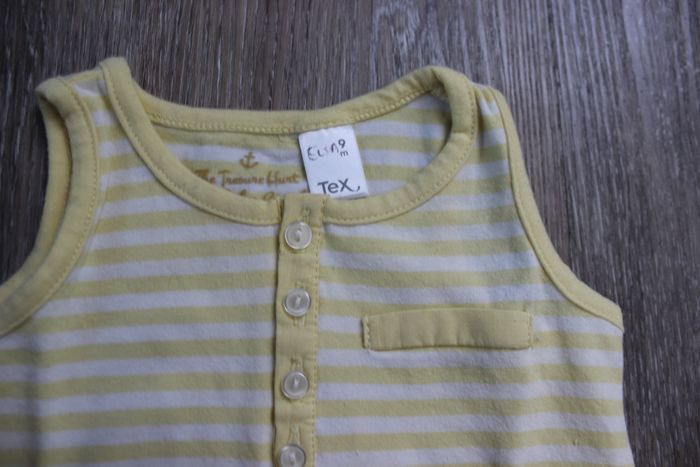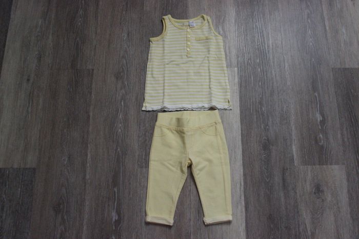 Joli ensemble qui comprend un débardeur 9 mois et un legging 6 mois. Aucun souci pour porter ensemble les 2 pièces pour un enfant qui met du 6 mois. Bouloches et légères taches sur le pantalon, voir 2 dernières photos. Haut en très bon état. N'hésitez pas à faire un lot sur mon dressing.