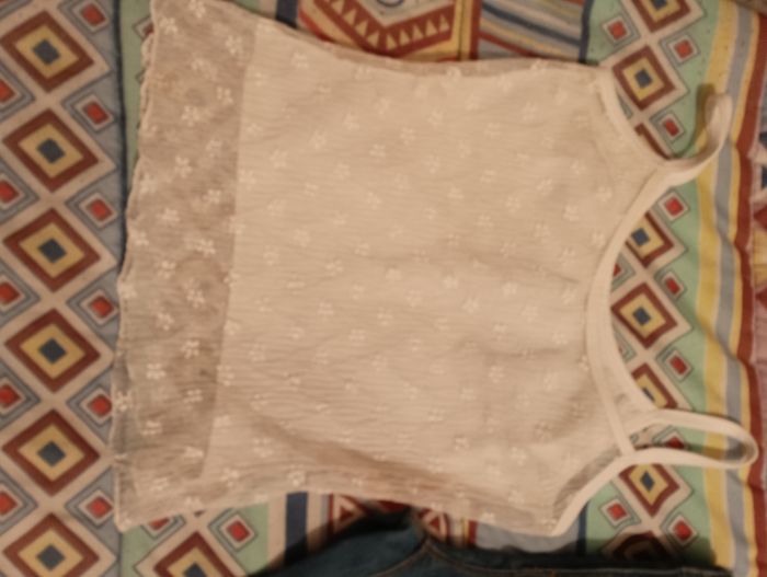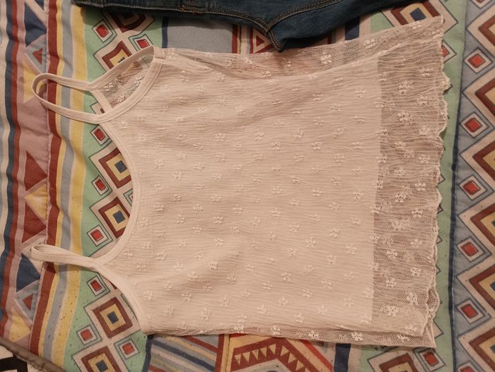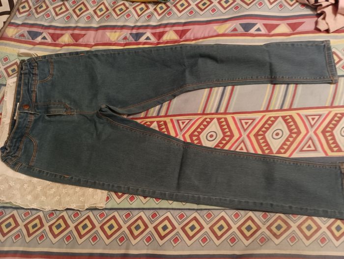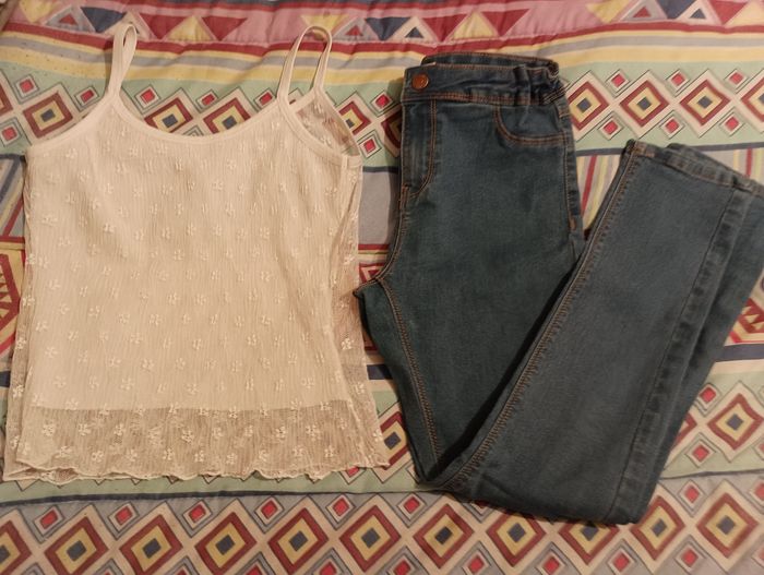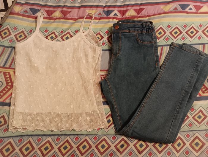 Je vends un jean avec son débardeur Un jegging Kiabi taille 10 ans possibilité de resserrer à la taille avec bouton de rechange Un débardeur blanc en dentelle avec doublure taille 10 ans Kiabivete
