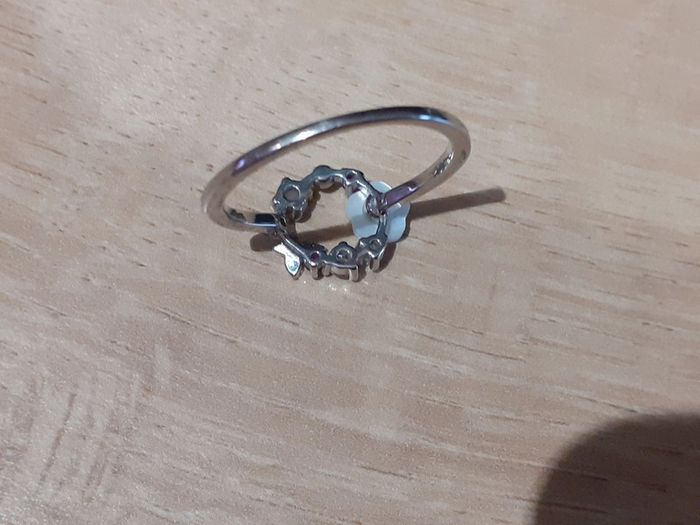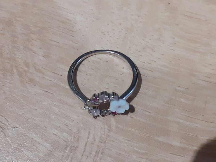 Bague en acier inoxydable avec zircon rose, violet et fleur nacré taille 60 . En très bon état Envoi rapide, soigné et sécurisé.