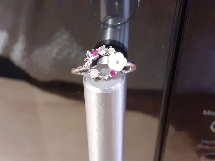 Bague en acier inoxydable avec zircon rose, violet et fleur nacré taille 60 - photo numéro 5