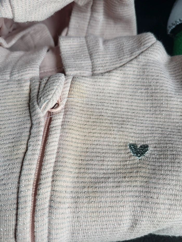 Survêtement composé d'un pantalon et d'une veste zippée à capuche. La veste présente une tâche/auréole sur le devant (cf photo 2) Taille 3 mois #jal3moisfille