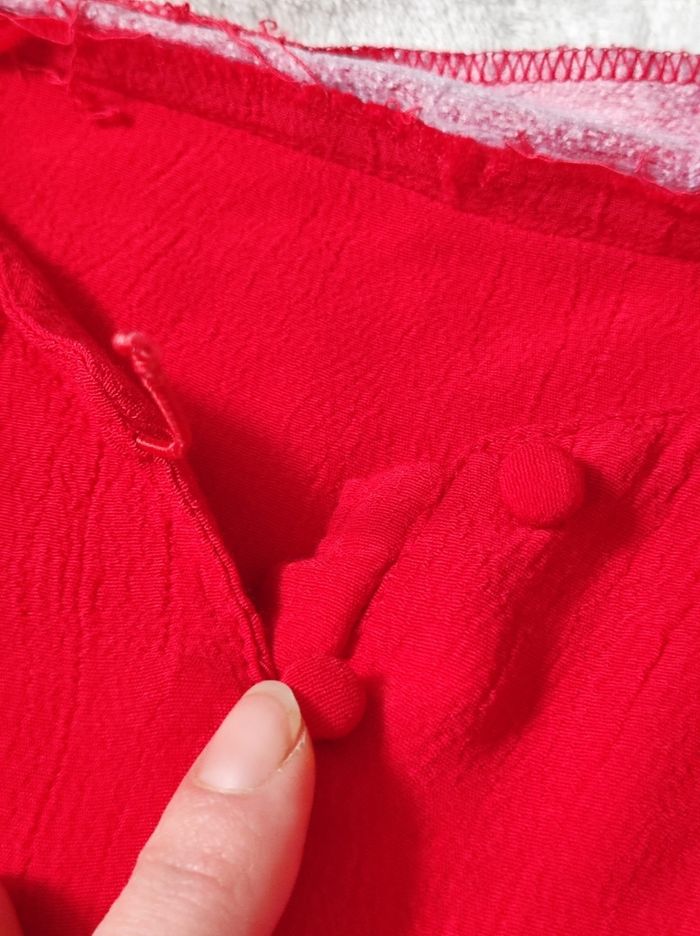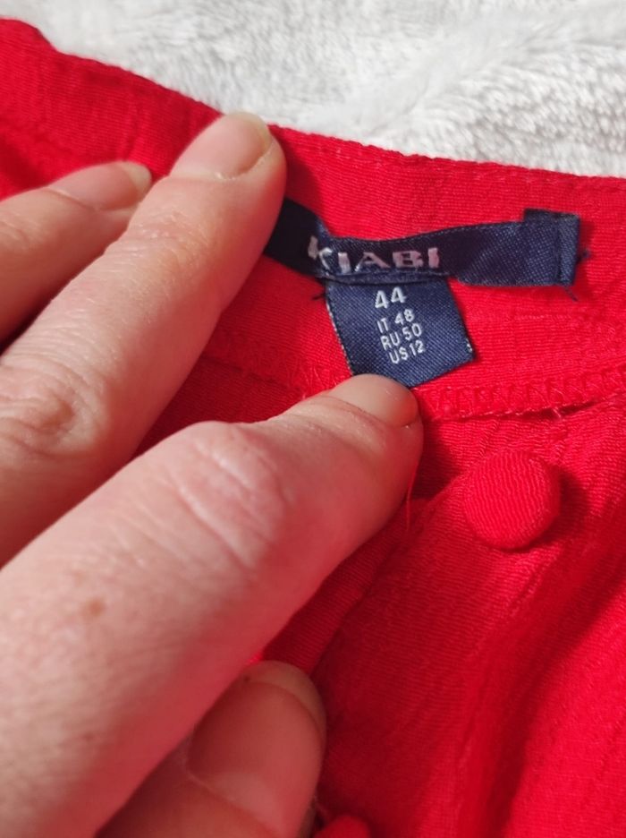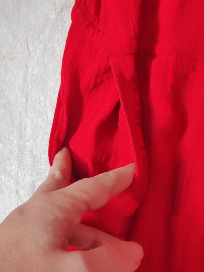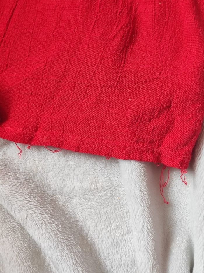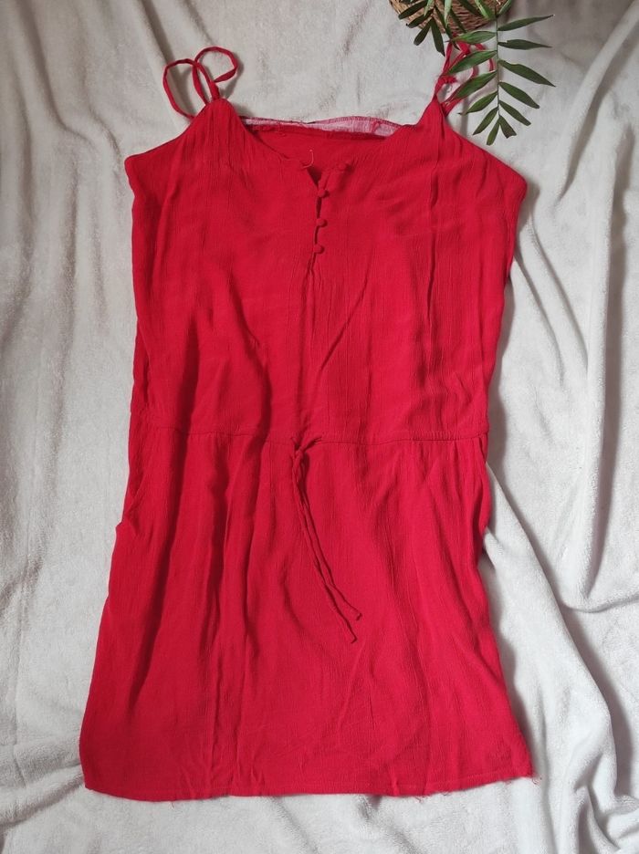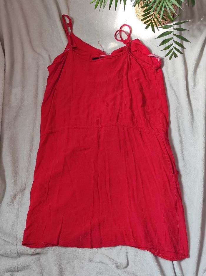 petite robe courte d'un rouge intense à bretelles fines et réglables. L'élastique d'attache du dernier bouton à craquer mais peut être recousu au besoin. Sur le bord en bas plusieurs fils ont sauté, sa peux se couper ( la couture d'origine a été grossière pour une marque connue ). Avec des poches de côté et un cordon à la taille pour affiner. Reste en bon état, pas de tâches. Marque Kiabi taille 44.