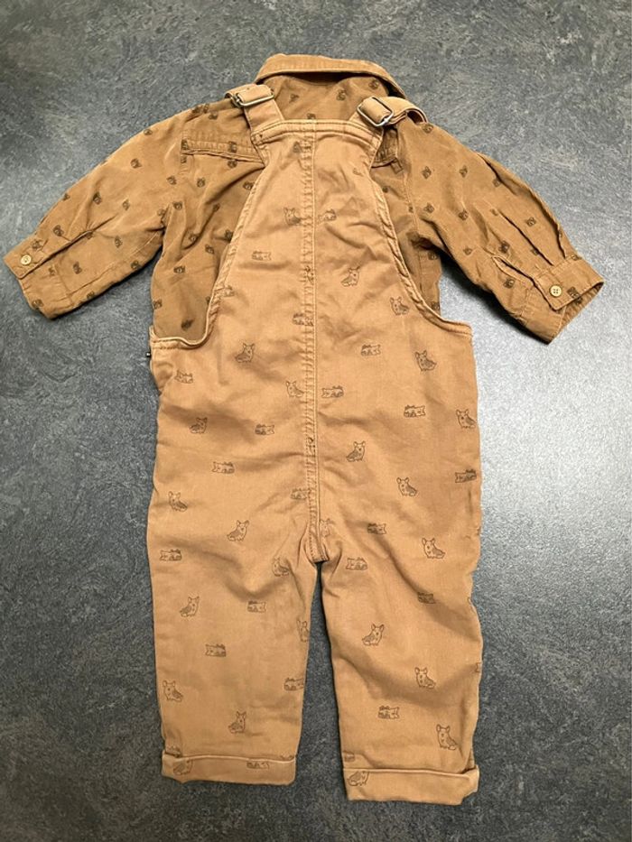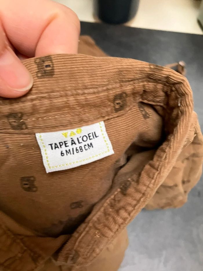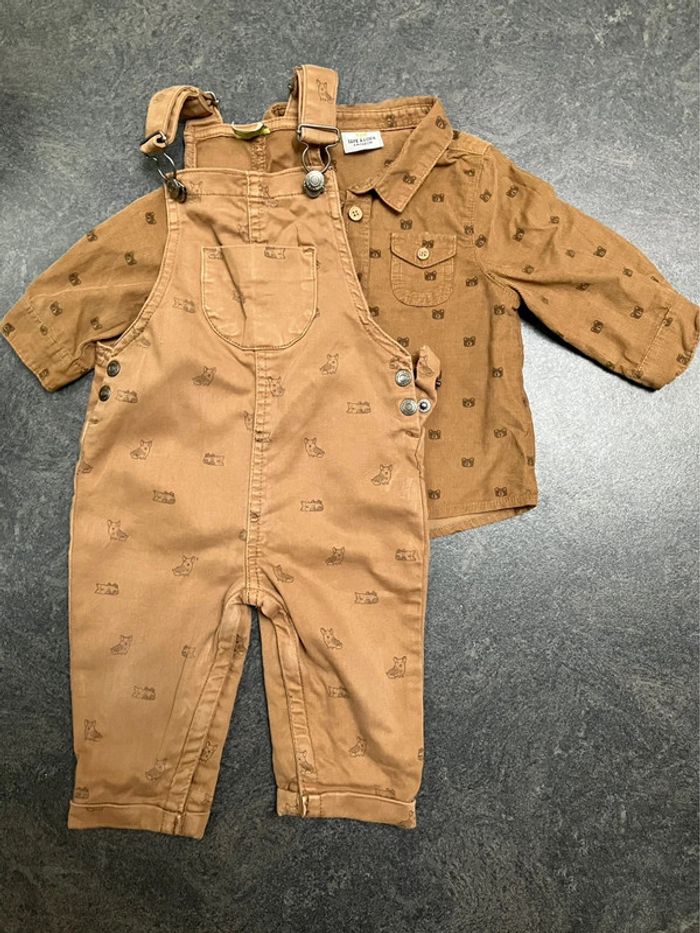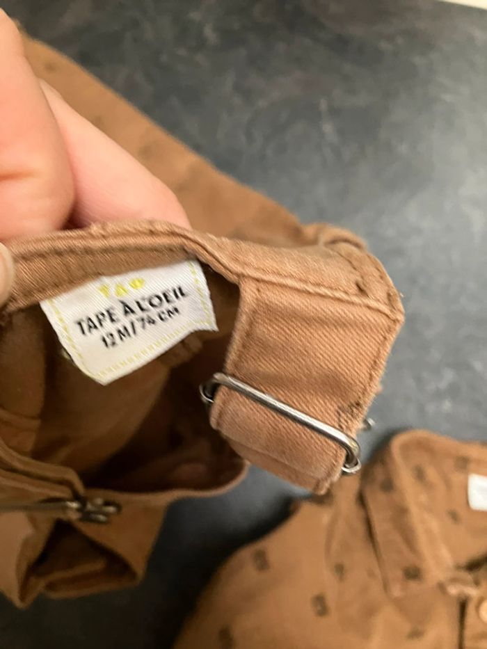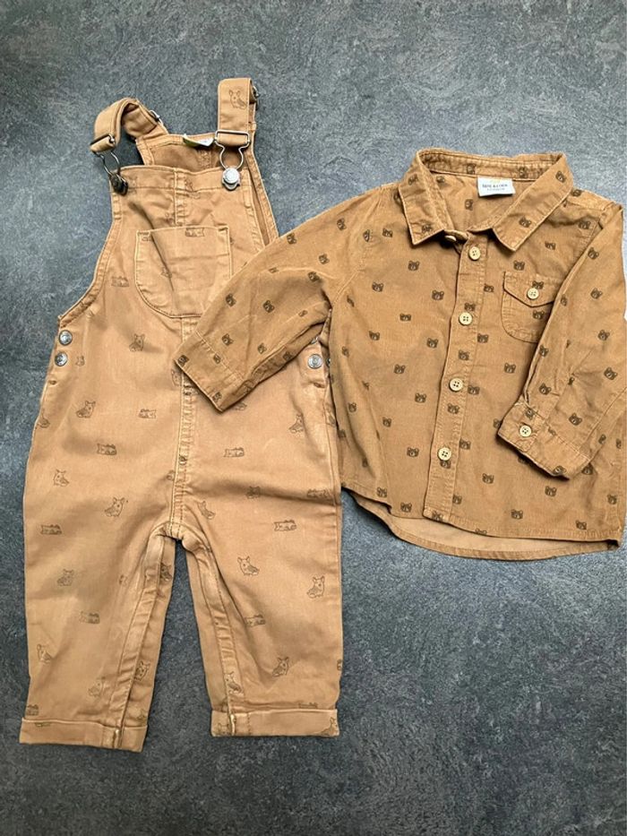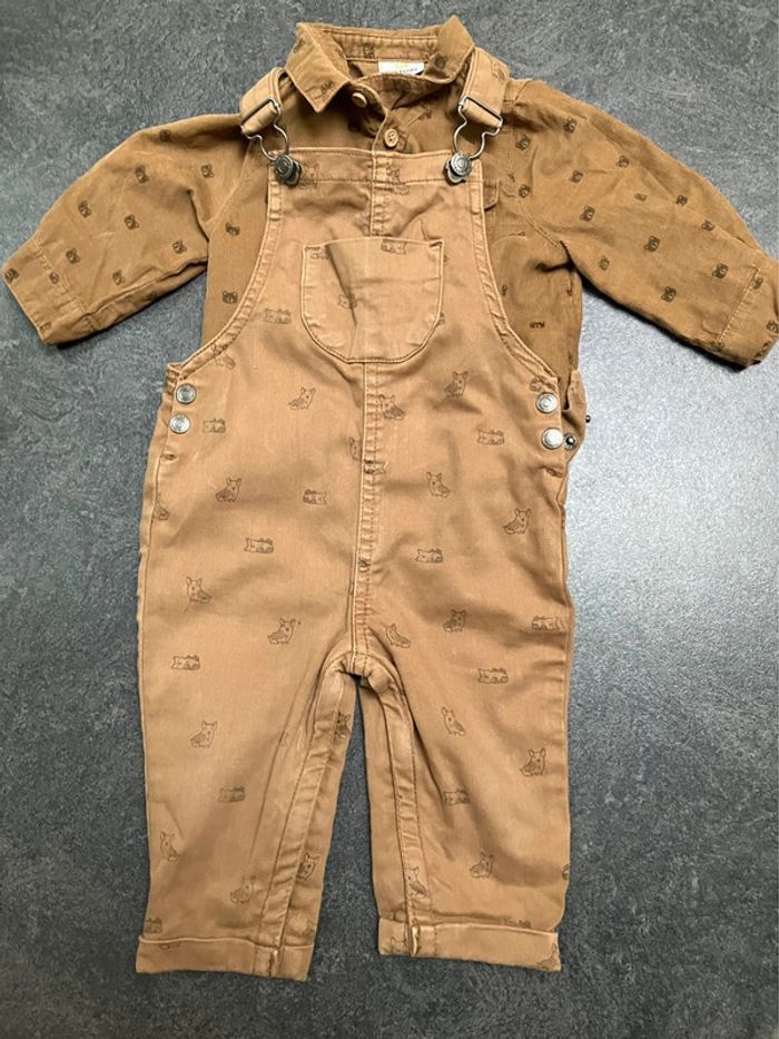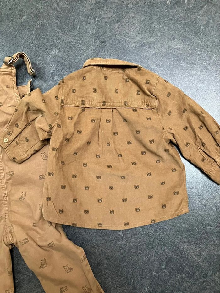 Salopette 12mois en coton élasthane se porte bien ar coupe ajustée Chemise 6 mois en velours J’ai également le pull en 6 mois qui va avec la salopette pull écru avec tête d ours
