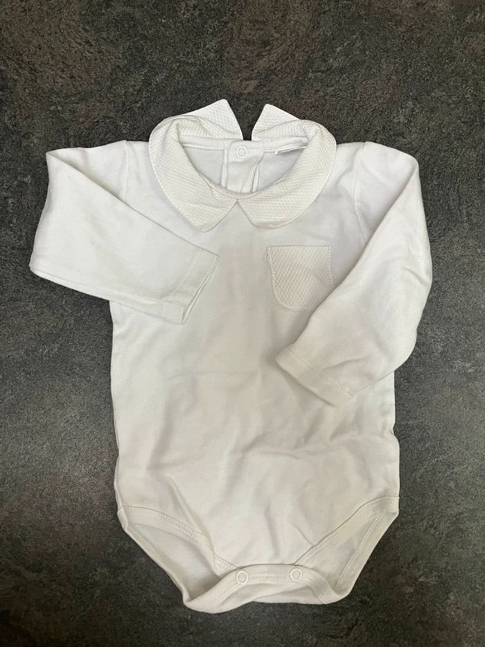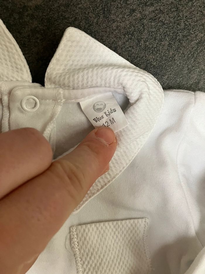 Salopette porté une fois parfait état en 9mois Matière un peu gratte sur le dessus toute douce S ouvre à l entrejambe Boutonnière du milieu reprisé car un peu trop grande mais acheté ainsi Body avec col 9/12mois parfait état