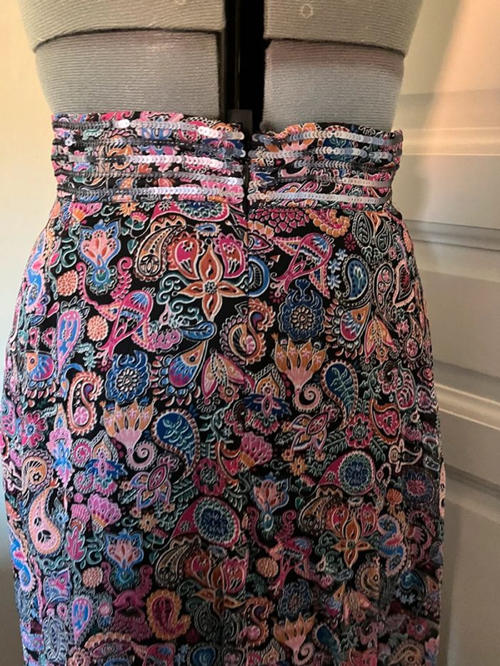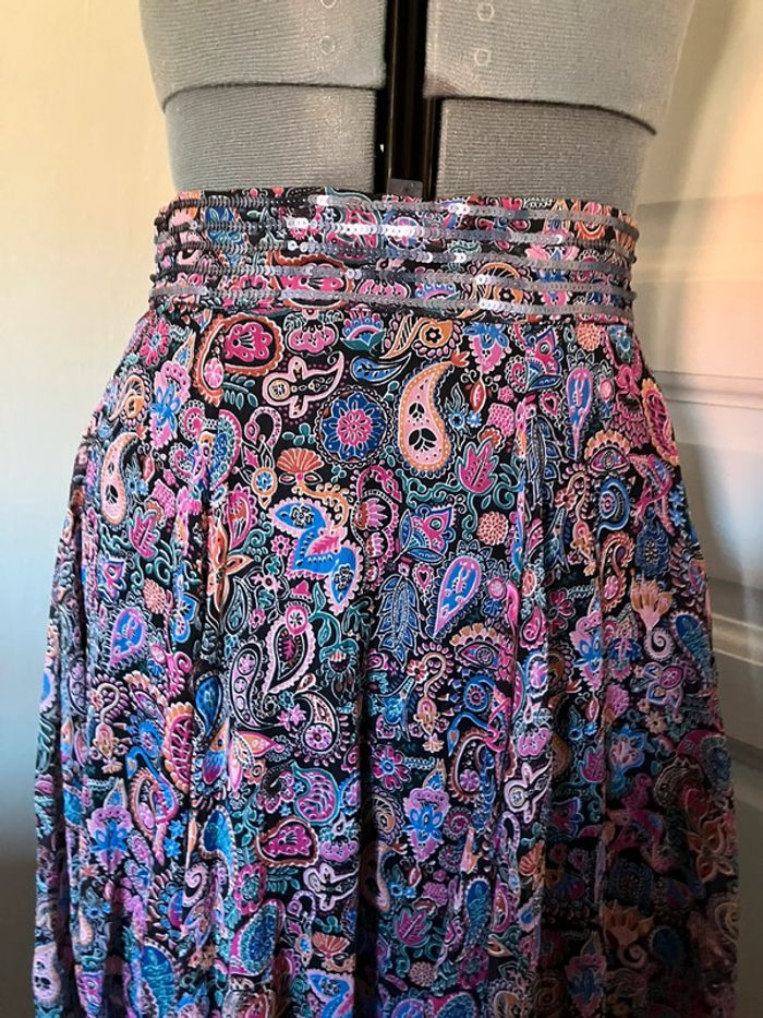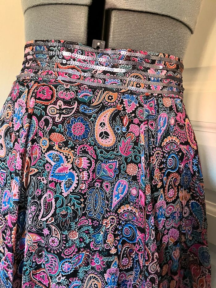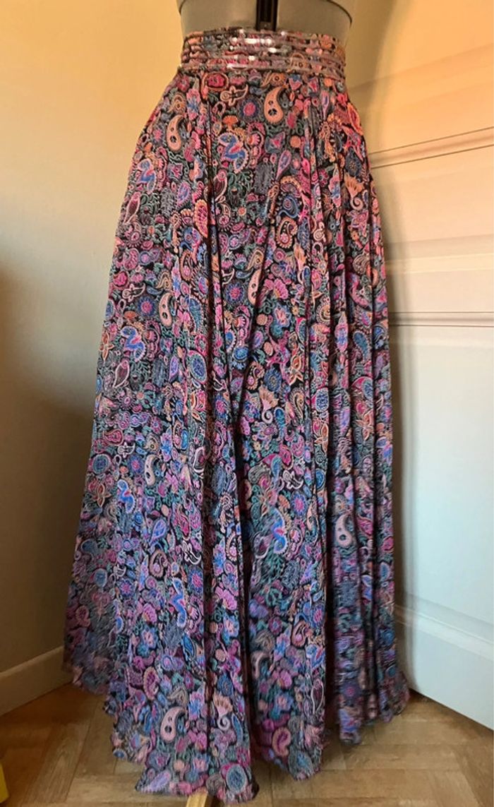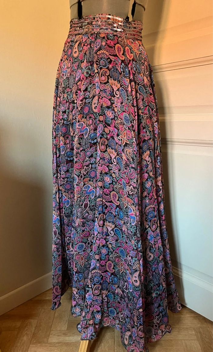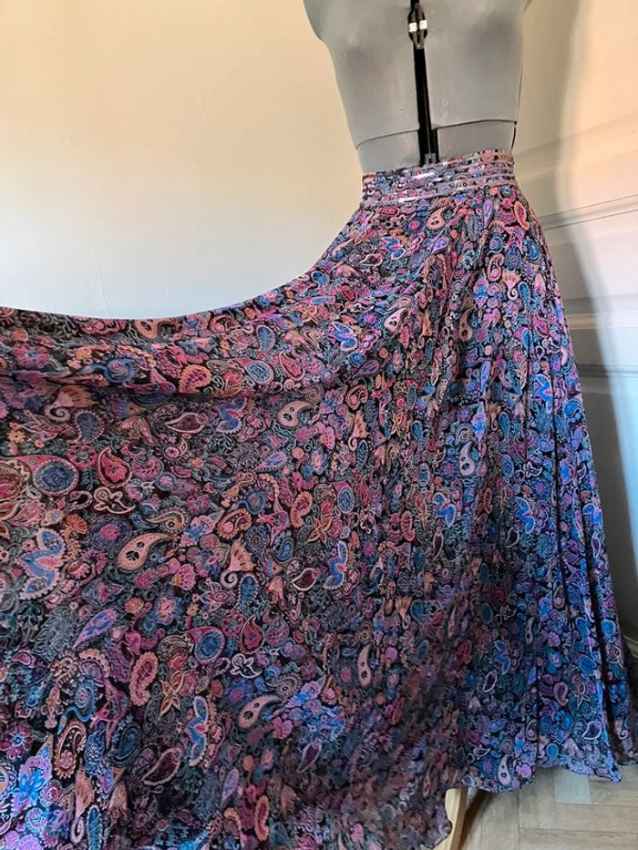 Jupe volume ample entièrement doublé Matière légère toucher soie Sequins cousues main Sr la ceinture Fermeture à glissière dos Jeu de quille pour le Volume Parfait état Poches dans la couture côté Largeur taille par demi 36,5cm Longueur totale :105cm Valeur neuve 380 euros