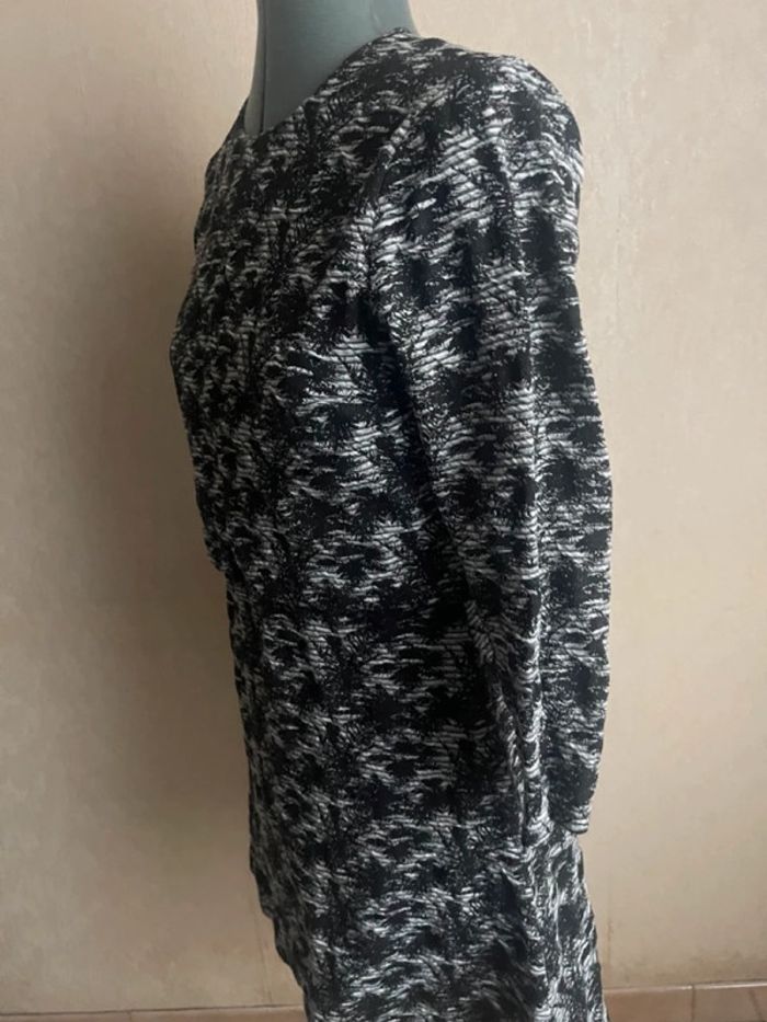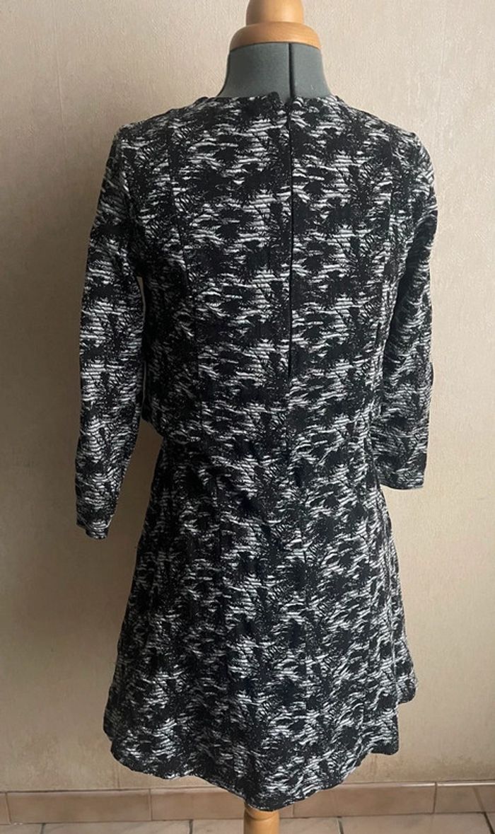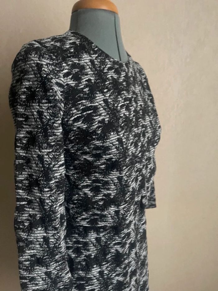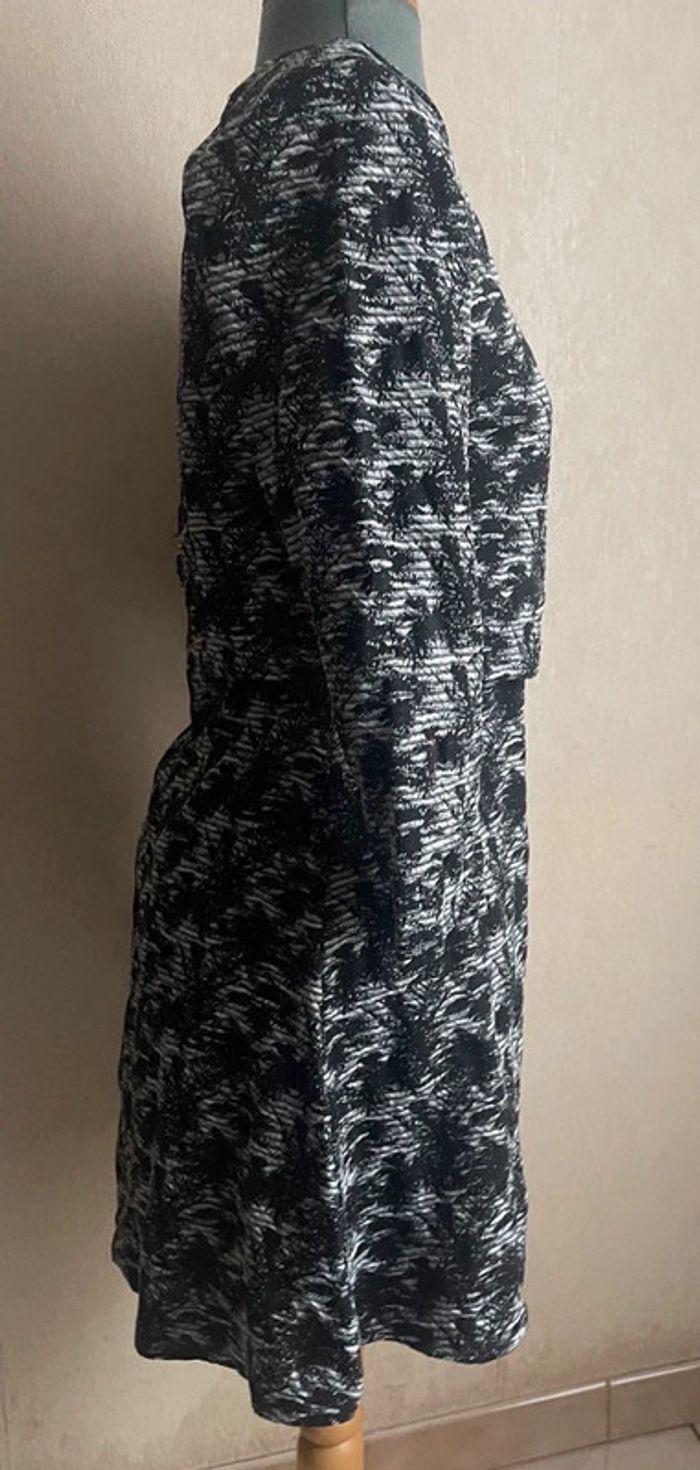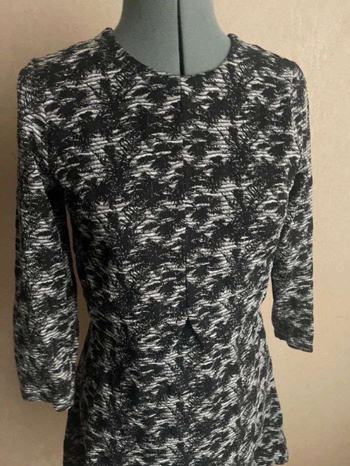 très belle robe en maille motif palmier robe d’hiver à porter avec des collants très confortable bien que près du corps car en maille. zip invisible milieu dos effet top et jupe mais évidement le haut et rattaché on est bien sûr une robe jupe effet trapèze manches longueur 3/4 longueur épaule bas 83cm 1/2 largeur poitrine 43 cm taille uk10 soit 38 taille 36/38
