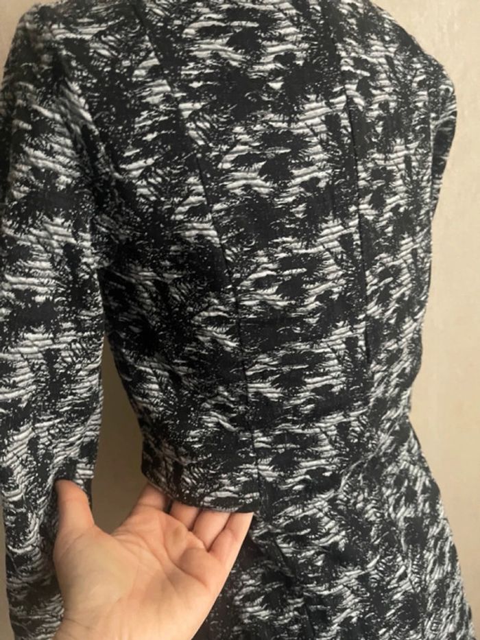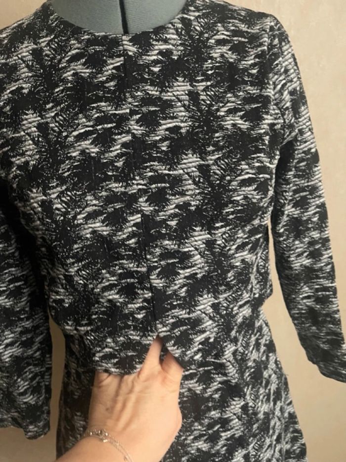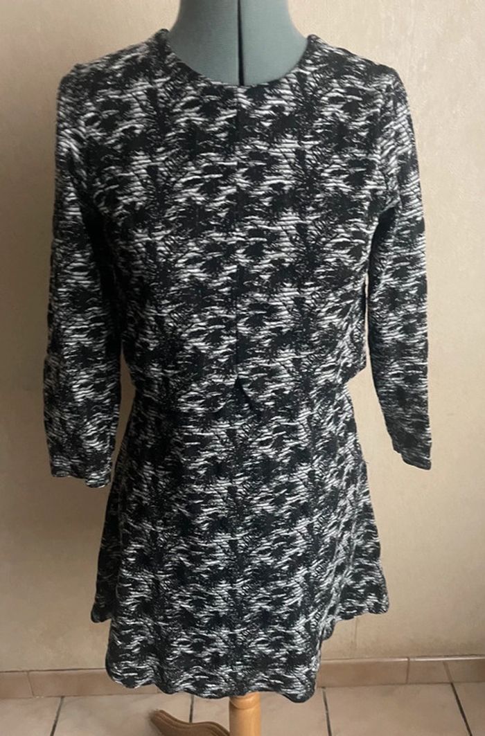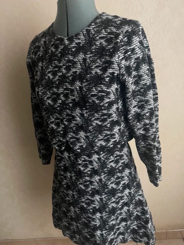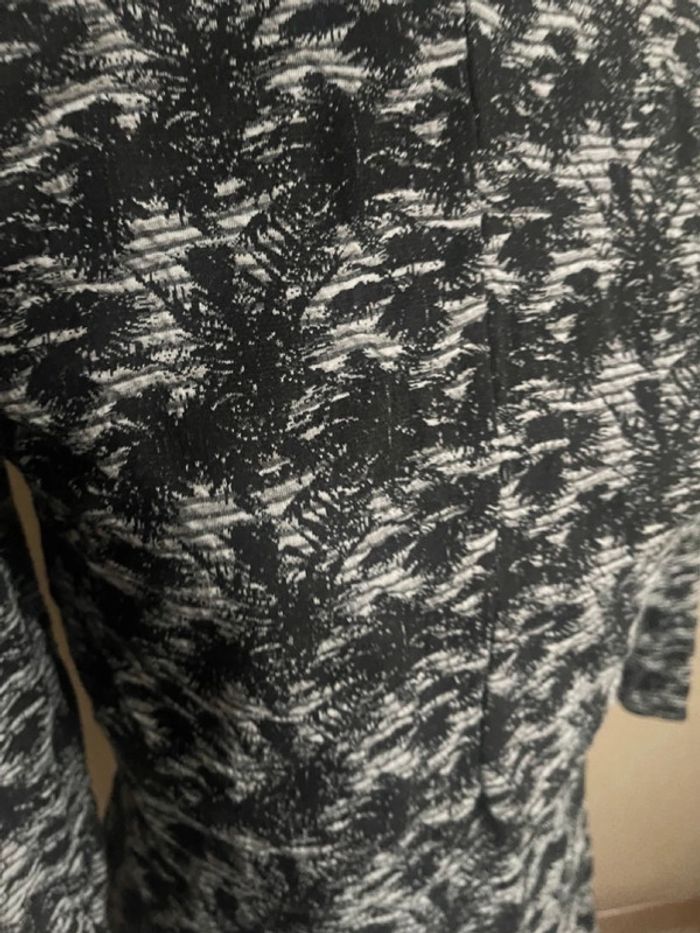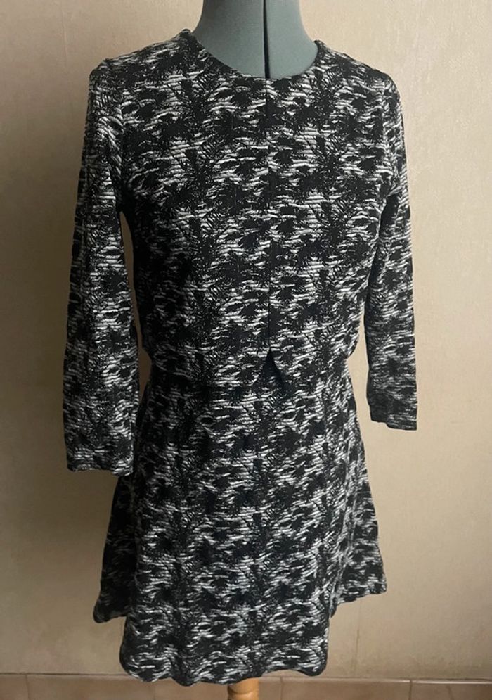 très belle robe en maille motif palmier robe d’hiver à porter avec des collants très confortable bien que près du corps car en maille. zip invisible milieu dos effet top et jupe mais évidement le haut et rattaché on est bien sûr une robe jupe effet trapèze manches longueur 3/4 longueur épaule bas 83cm 1/2 largeur poitrine 43 cm taille uk10 soit 38 taille 36/38