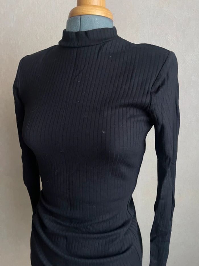 Robe sobre moulante hyper confortable grace à ma maille cotelé Belle matière compacte non transparente Épaulettes permettant une belle carrure Manches longues Matière opaque très strech que vous pouvez ajuster sur vous à volonté Se porte moulant Longueur épaule bas 84cm 1/2 tour poitrine 41cm Col légèrement montant parfait état comme neuve
