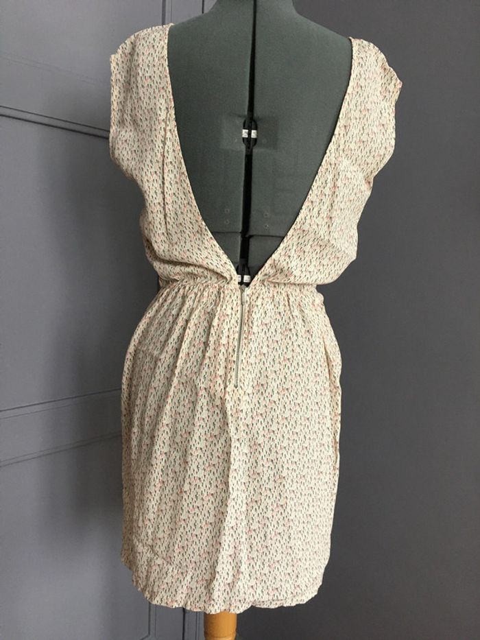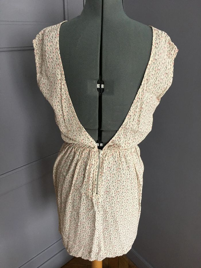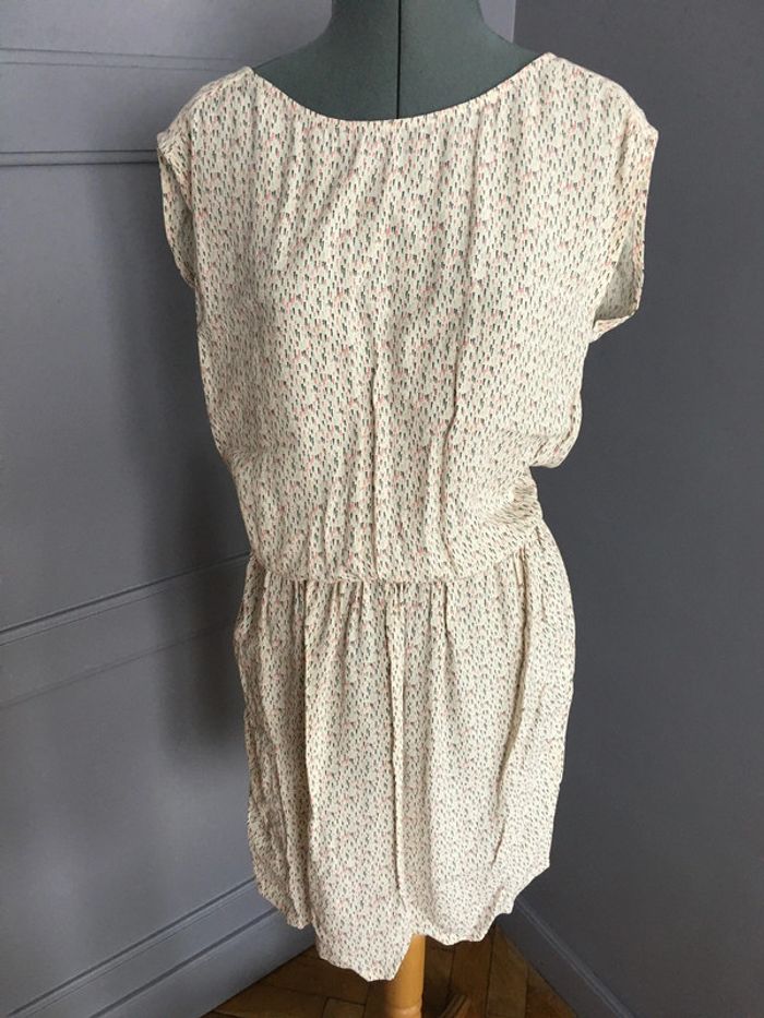 robe 100%viscose longueur épaule bas environ 96cm taille M Dos V Matière fluide et agréable Fond beige petit imprimé discret Comme neuve Taille normalement