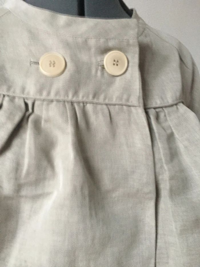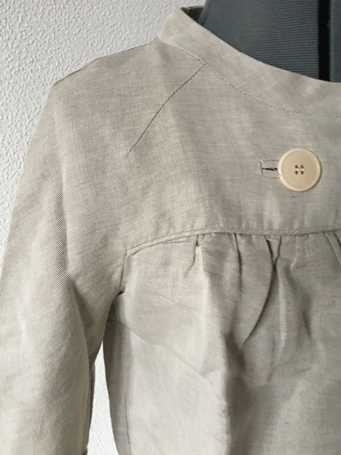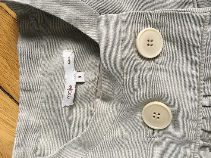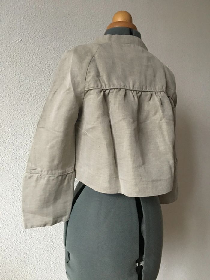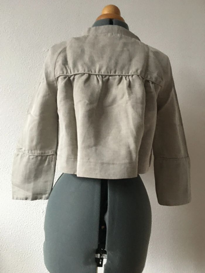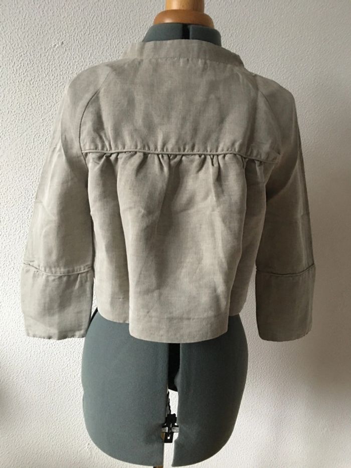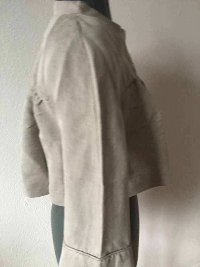 veste en lin comme neuve veste courte à porter sur une robe ou un jean taille haute manches 3/4 taille 0: 34/36 mesures prise sous les emmanchures par moitié :50cm longueur milieu dos : 44cm compo: 66%lin 34%coton coloris clair gris /taupé