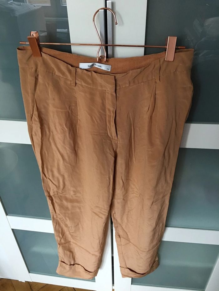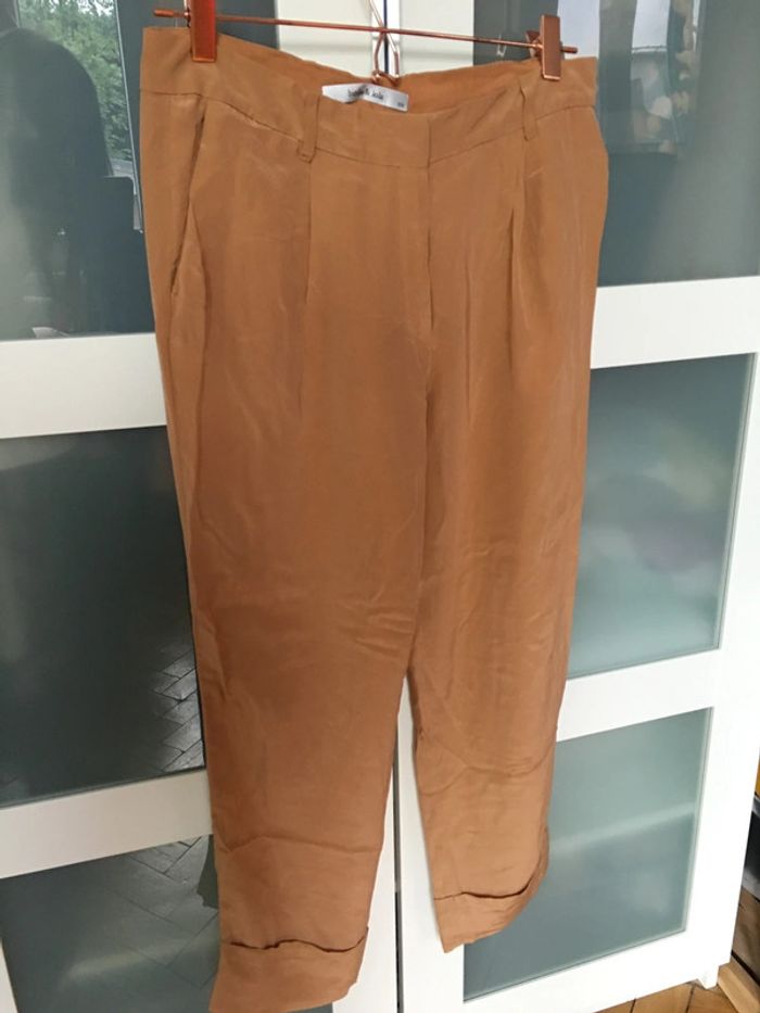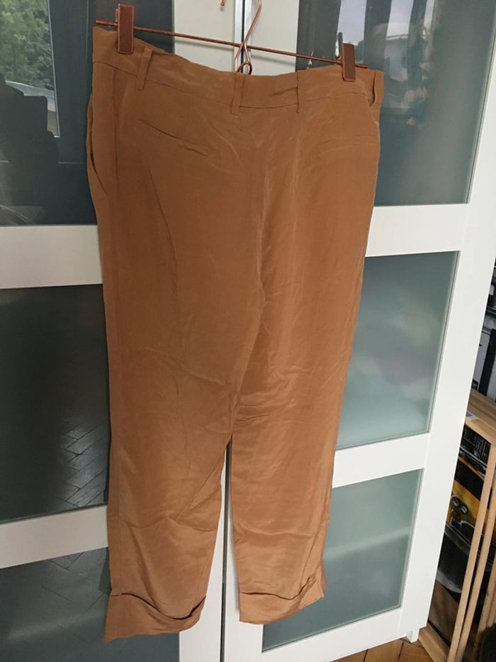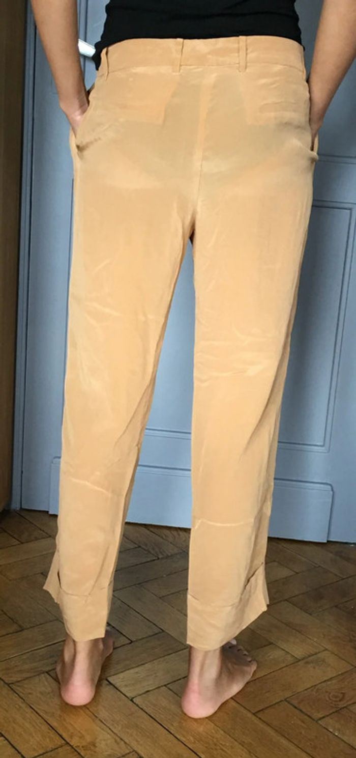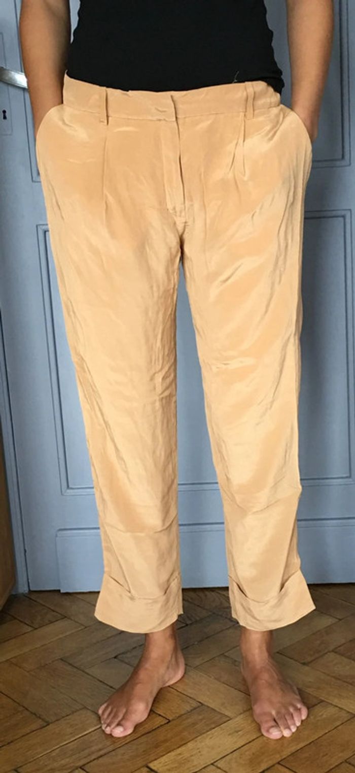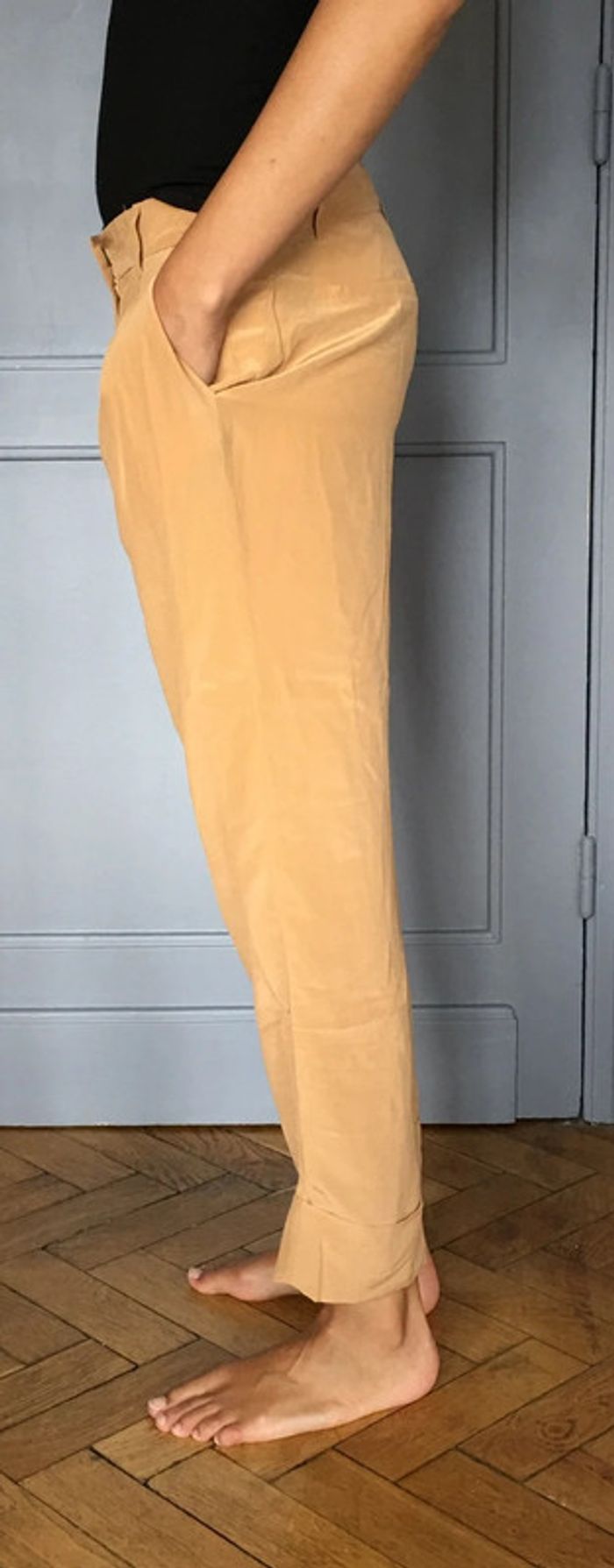 Pantalon loose, carrot fit 100%soie Taille 38 taille bien Longueur 7/8 Soie lavée, super douce et fluide Super agréable au porter Parfait état , comme neuf La bonne couleur est plus proche des photos prise sur ceintre Un coloris beige sablé
