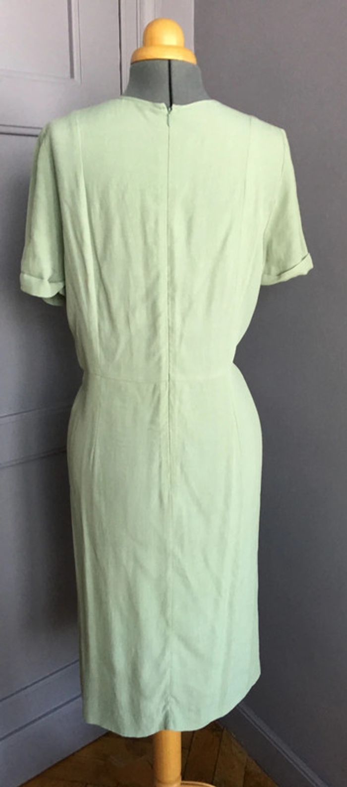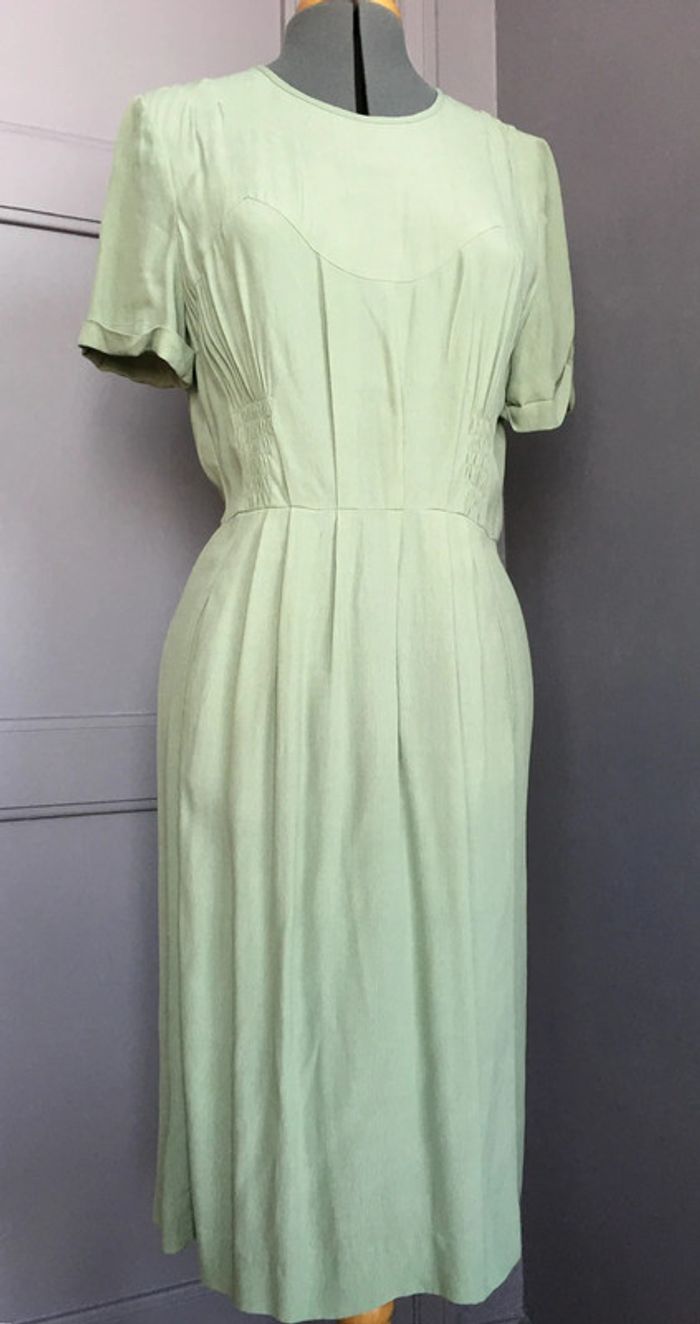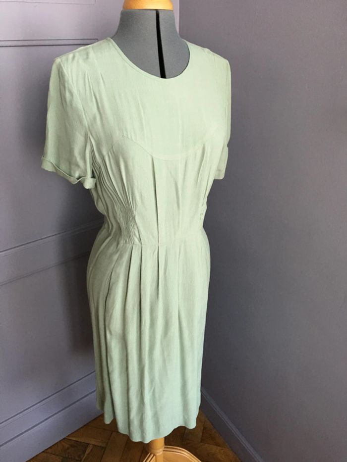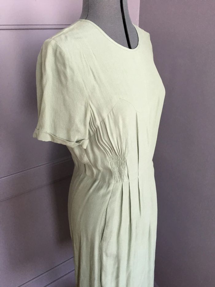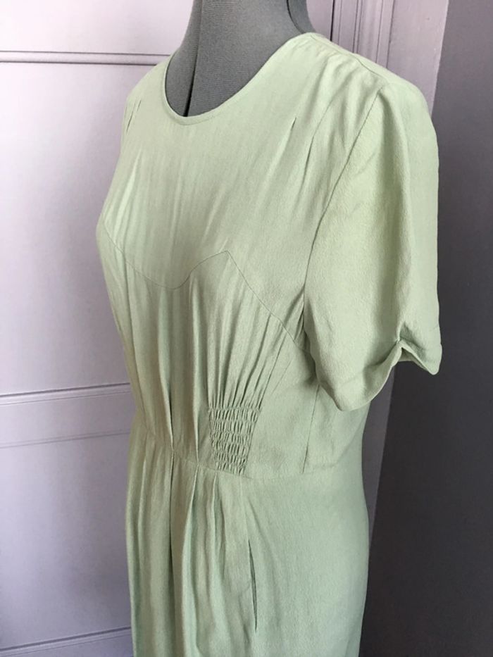 robe fluide mélange viscose effet crêpe pas transparente longueur genoux poches devant coloris vert d’eau/ un peu plus foncé que sur les photos Jamais porter neuve en parfait état Look un peu rétro Très agréable Taille normalement
