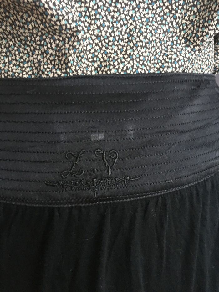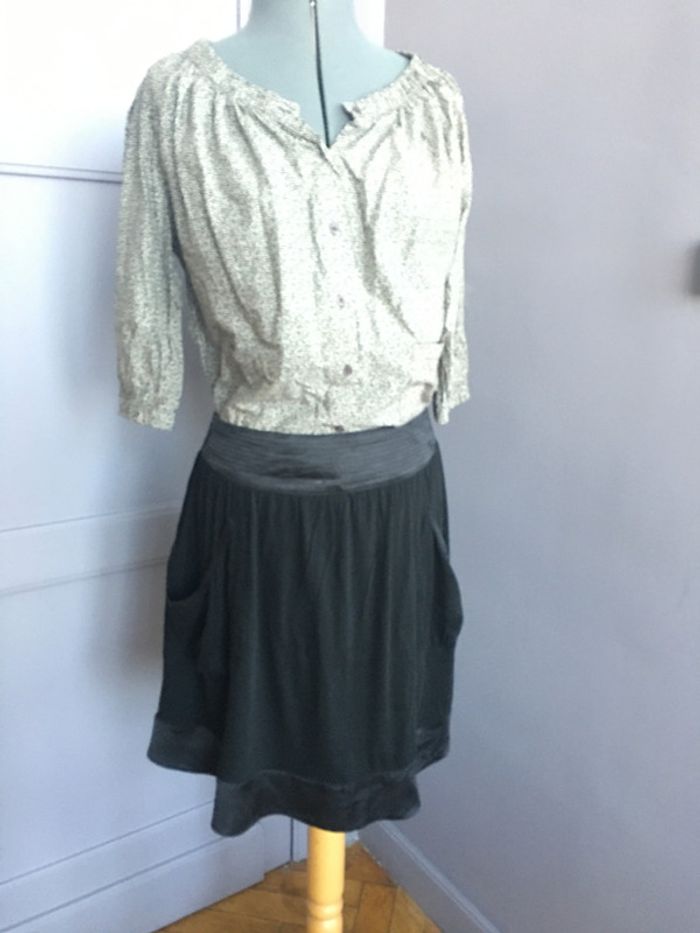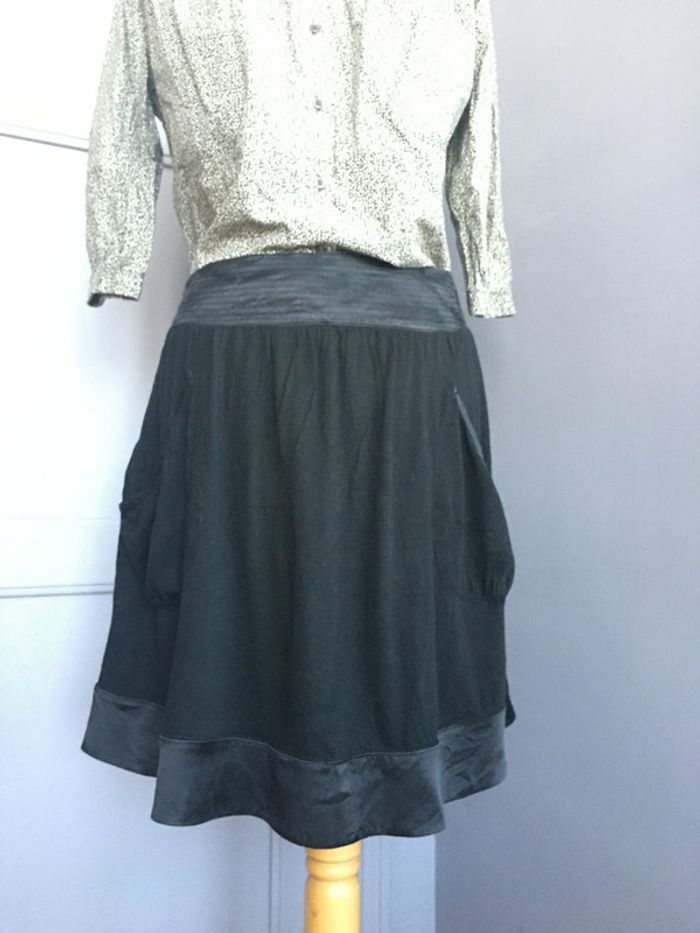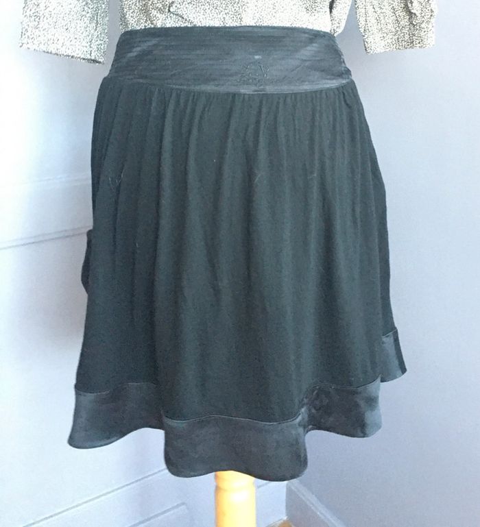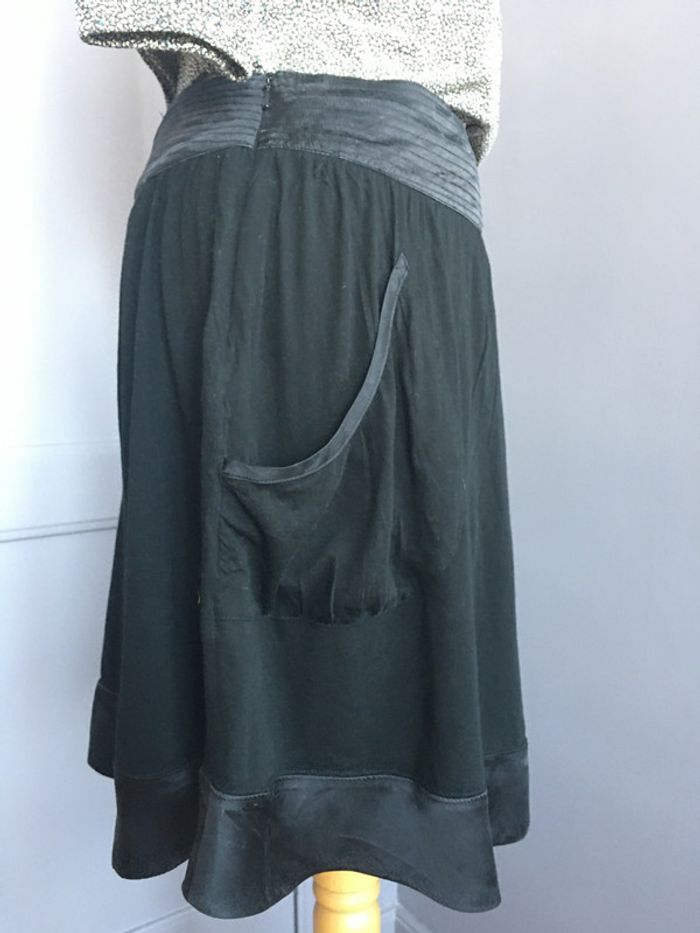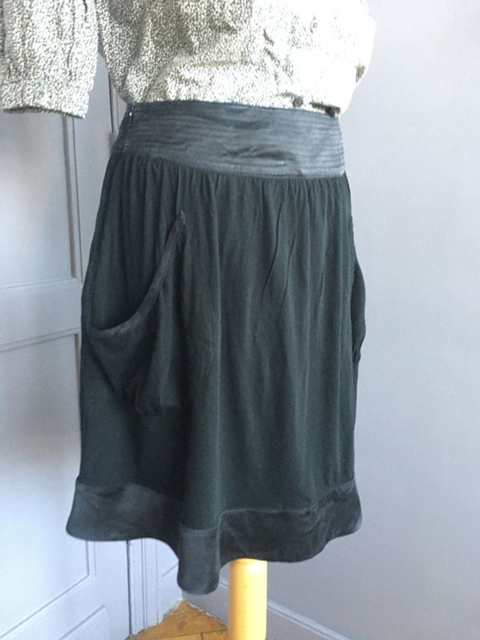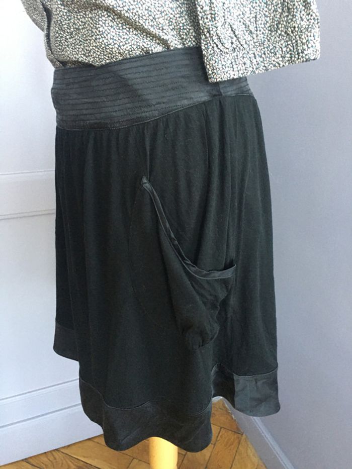 jupe fluide en maille empiècement taille et base en satin matière principale 70%coton et 30%laine jupe doublée en maille 100%viscose la maille présente de légère trace d’usures ce qui explique son prix bas qui ne sera pas baissé d’avantage. longueur totale 51cm taille par demie 40cm