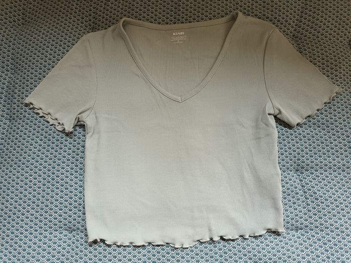 Crop top manches courtes vert clair Marque : Kiabi Taille : S 96% coton, 4% élasthanne Parfait état Largeur des épaules : 38 cm Longueur : 41 cm