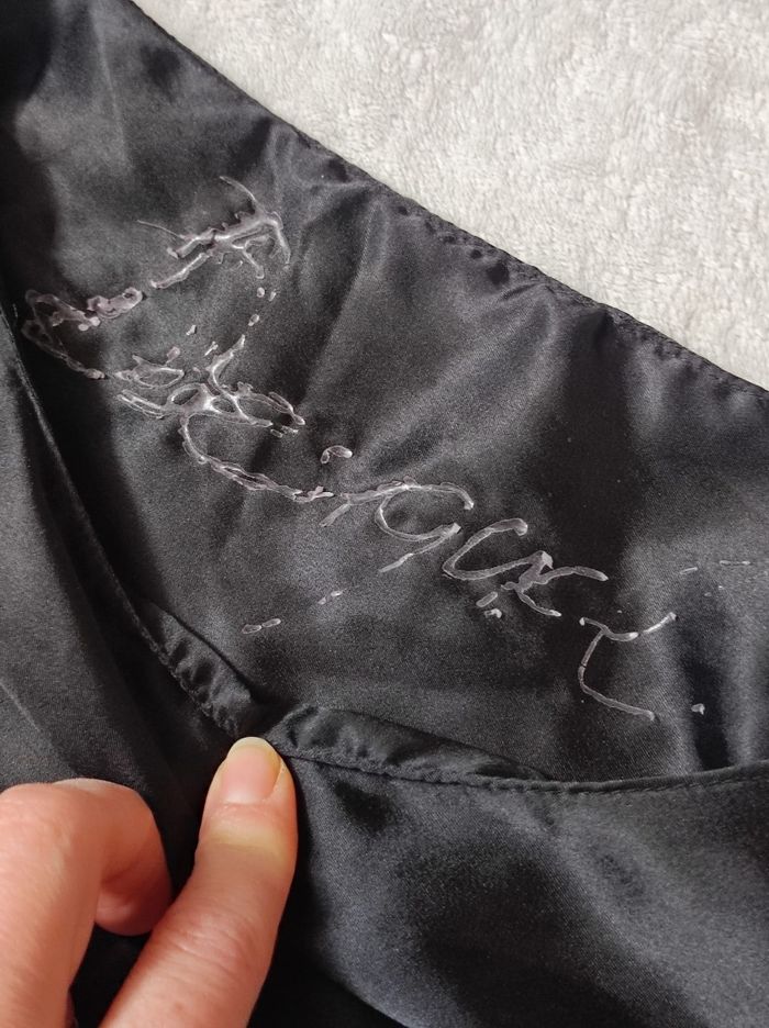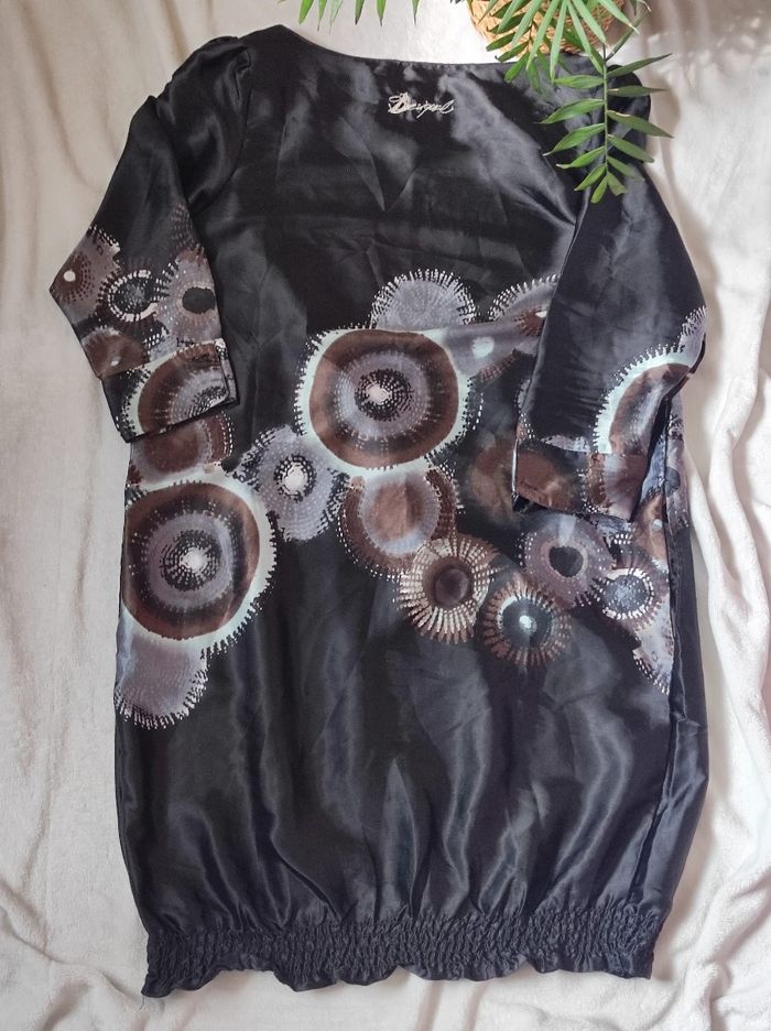 petite robe courte à manches longues 3/4, matière soyeuse et douce au toucher. Bord du bas élastique , le flocage intérieur de la marque est légèrement effacé, hormis cela la robe est en très bon état. Épaulettes au niveau des épaules. Marque Desigual en taille 40.