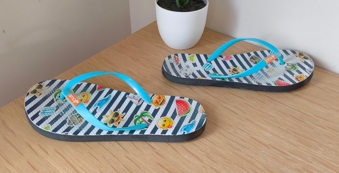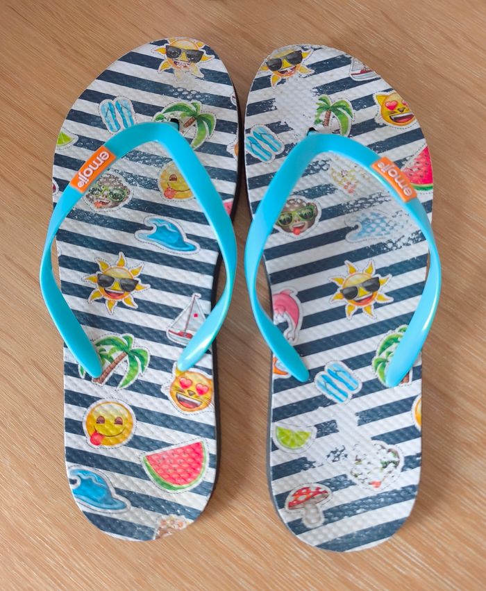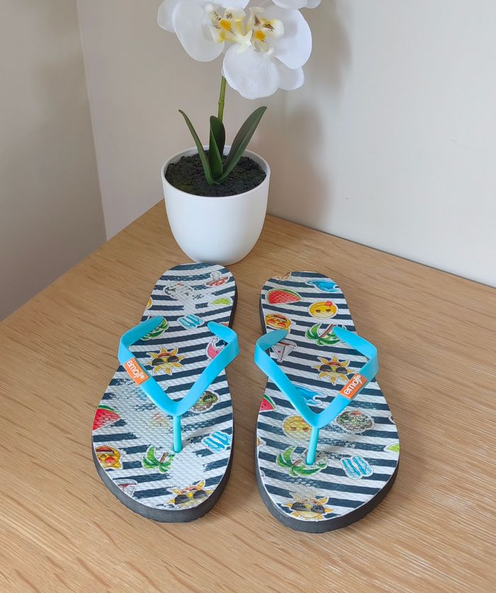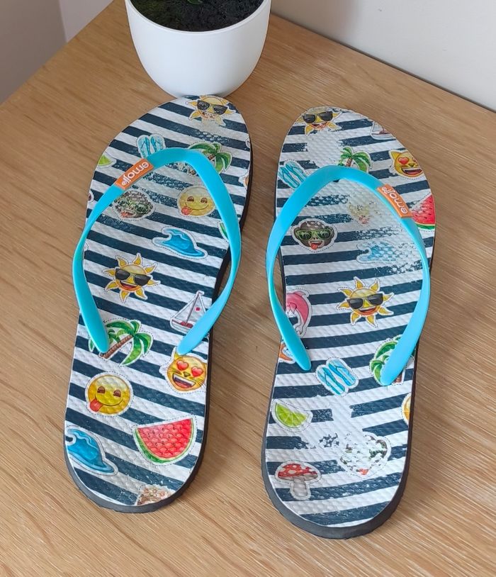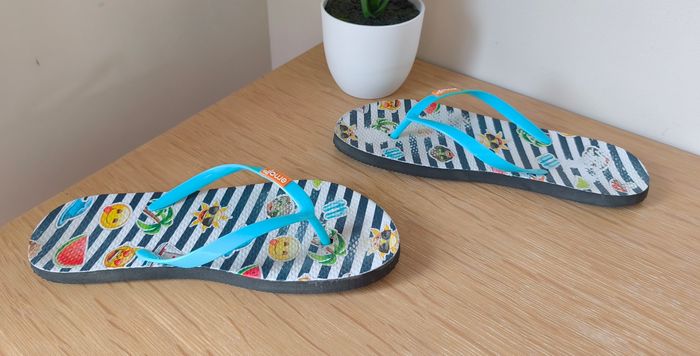 Tongs de la marque EMOJI - Motif : Smiley - Bride en caoutchouc - Semelle en mousse - Pointure : 36/37 ❌ Bon état car les motifs sont un peu effacé mais le reste est correct, comme le montre les photos #kat02600chaussure36 #kat02600chaussure37 #tongsmiley36 #tongsmiley37 #tongemoji36 #tongemoji37 #tong36 #tong37 #smiley #emoji