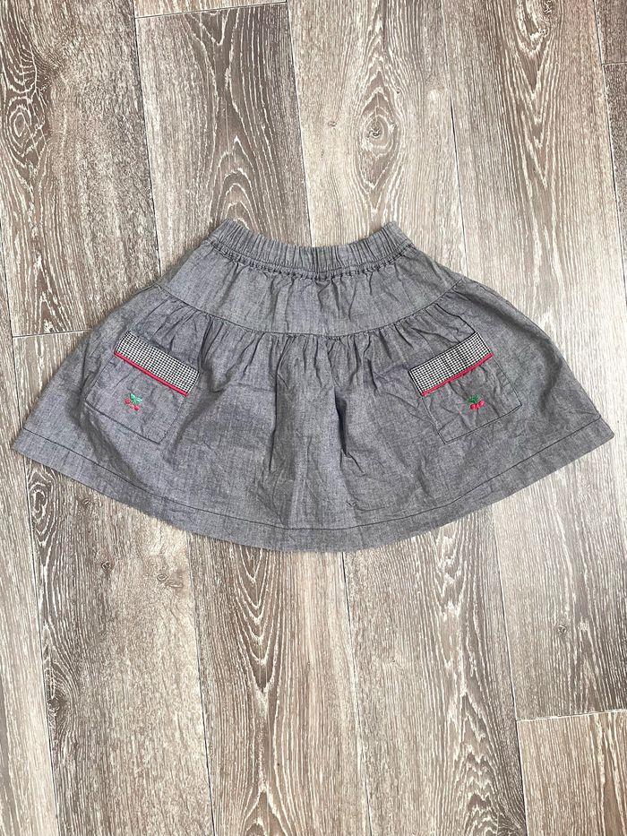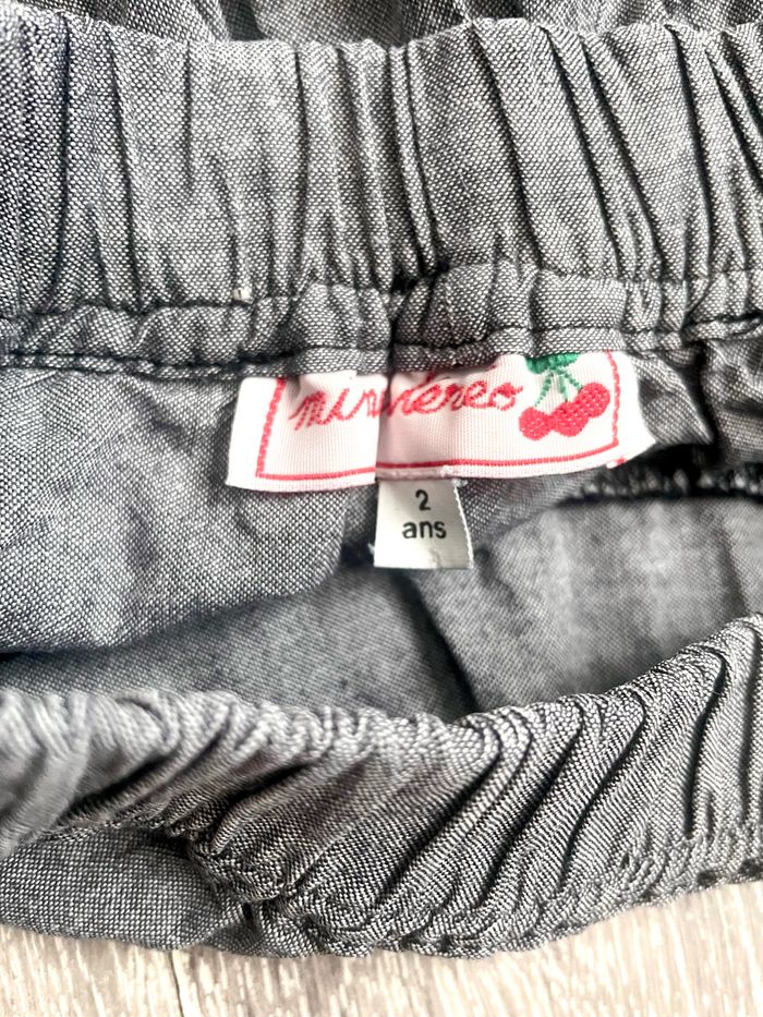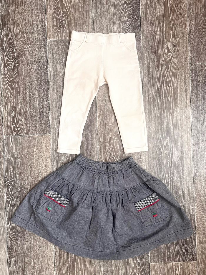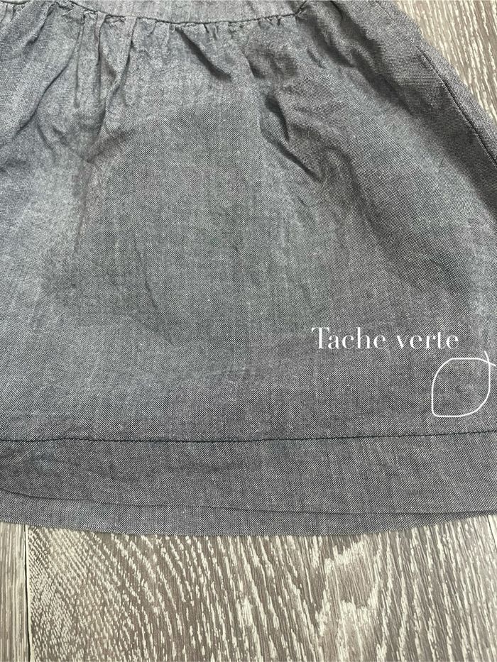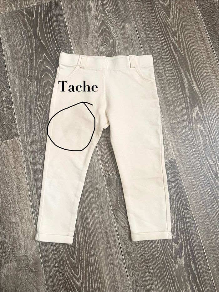 Jupe en toile fine grise Poches à l’avant avec motifs de cerises Petite tache de feutre vert (photo) Jeggings coupe skinny Couleur nude qui a décoloré Bouloches (photo) Tache au niveau d’un genou (photos)