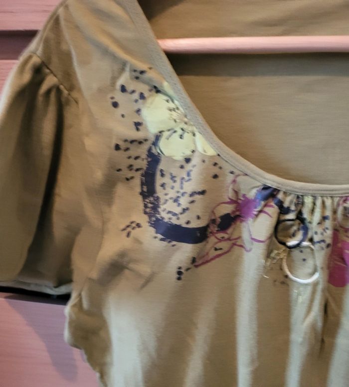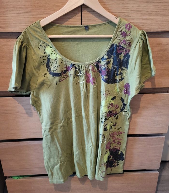 Tee shirt vert à motif florale de chez kiabi en taille 50/52, bon état. 60 cm d’aisselle à aisselle et longueur 70 cm. #floreteddy_taille50 #floreteddy_taille52