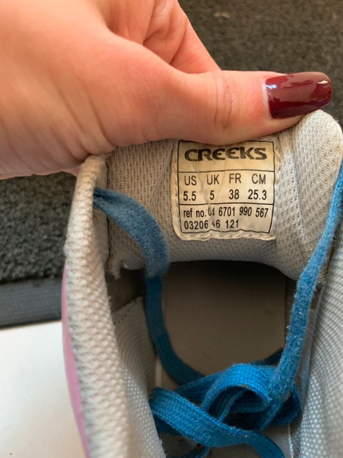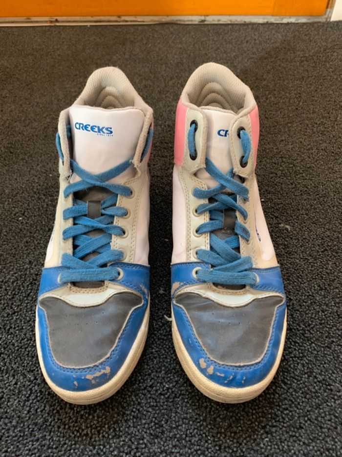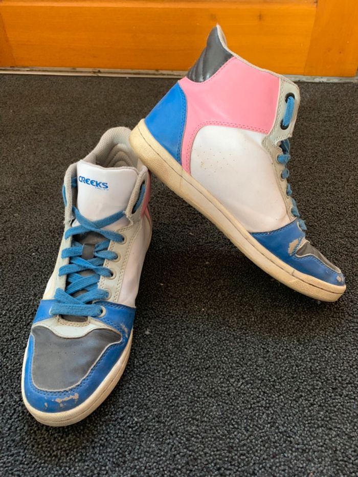 Jolies baskets creeks roses bleus et blanches. portées elles ont quelques défauts (voir photo 4) sinon elles sont en très bon état. #baskets #basketsfemme #basketsmontantes #creeks #bleu #noir #rose #blanc