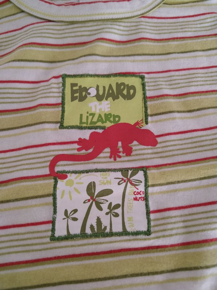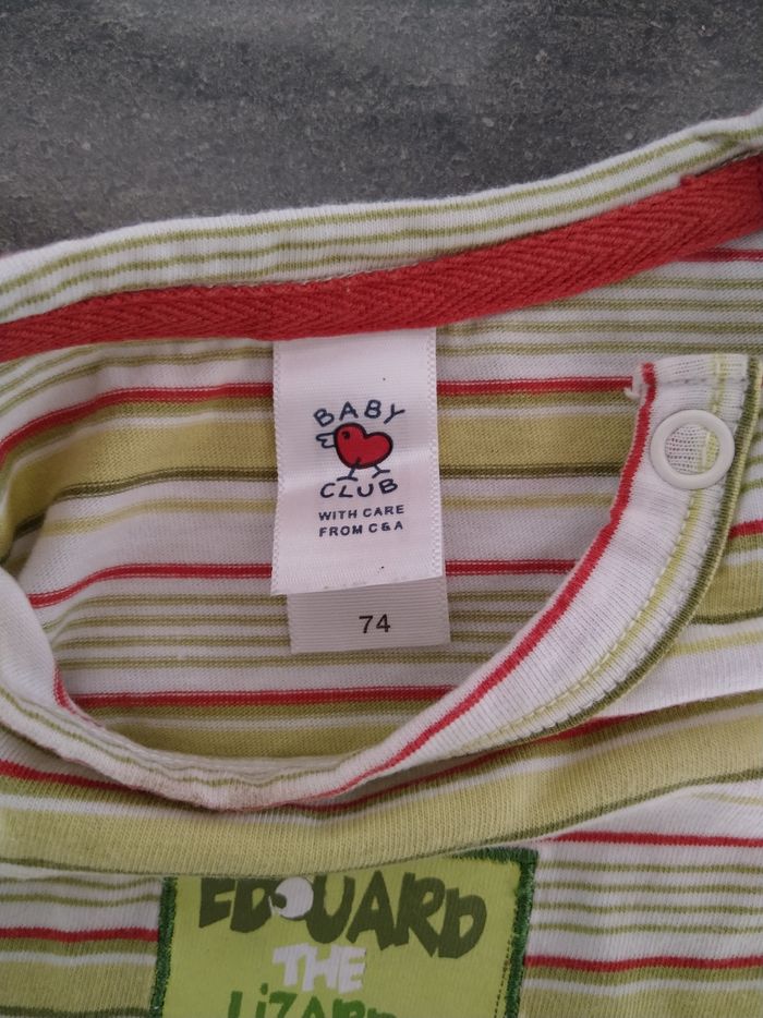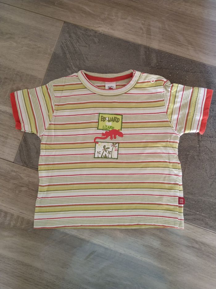 T-shirt à manches courtes Marque Baby Club by C&A Taille 12 mois, 74 cm • Coloris vert pomme, blanc, rouge • Rayé/Rayures • Edouard the lizard • Pressions au col • Tissu fin En très bon état #evelyne_garcons_12mois #evelyne_garcons