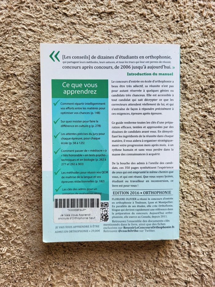 ⭐️ Nombreux livres dans mon dressing et réductions sur les lots activées ✨️ 📚 Livre "Je vais vous apprendre à être admis en orthophonie" par Floriane Olivier, créatrice du blog Orthoflonie Méthode et secret pour réussir le concours d'orthophonie Éditions 2016 📖 Bon état général, quelques petites marques sur la couverture Pages sans usure importante ni annotations 📍Pour tous les candidats et toutes les écoles, écrits et oraux 📕 Floriane Olivier propose des conseils pratiques, des exercices et une méthodologie efficace pour réussir.