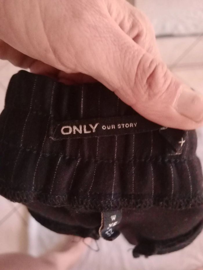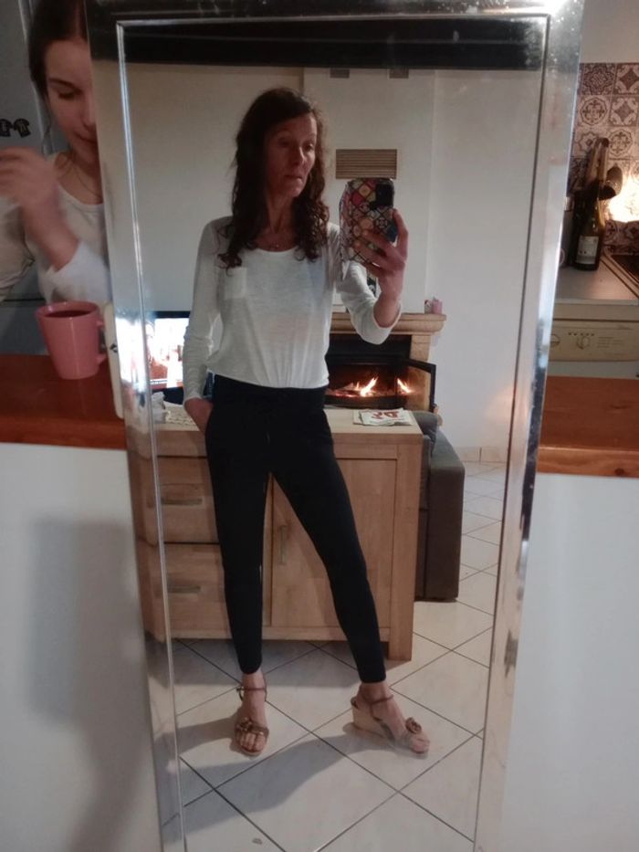 Aspect neuf 😍 Coupe type cigarette resserré dans le bas, le pantalon est magnifique ❤️😘 Ceinture élastique un lien devant Présence de deux poches au niveau des hanches Véritablement noir avec fines rayures blanches qui partent du haut vers le bas ce qui allonge la jambe et affine ☺️ Peut-être porté aussi bien pour des rendez-vous (avec talons et un blazer ...très féminin 😍) Ou avec une paire de snickers pour un look plus décontracté Le tissu est qualitatif, épais À l'arrière deux fausses poches #carineleray_femme_34