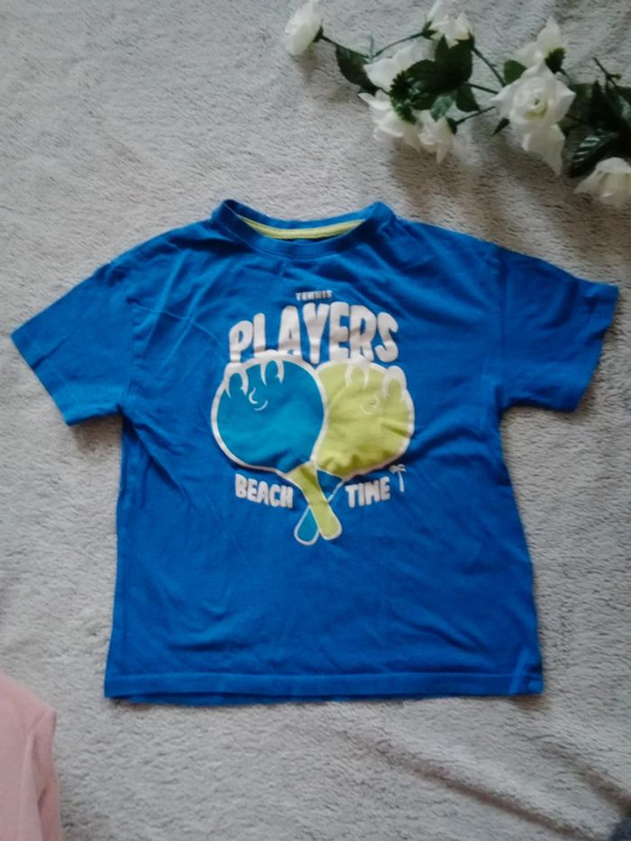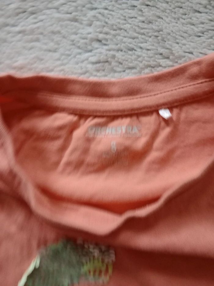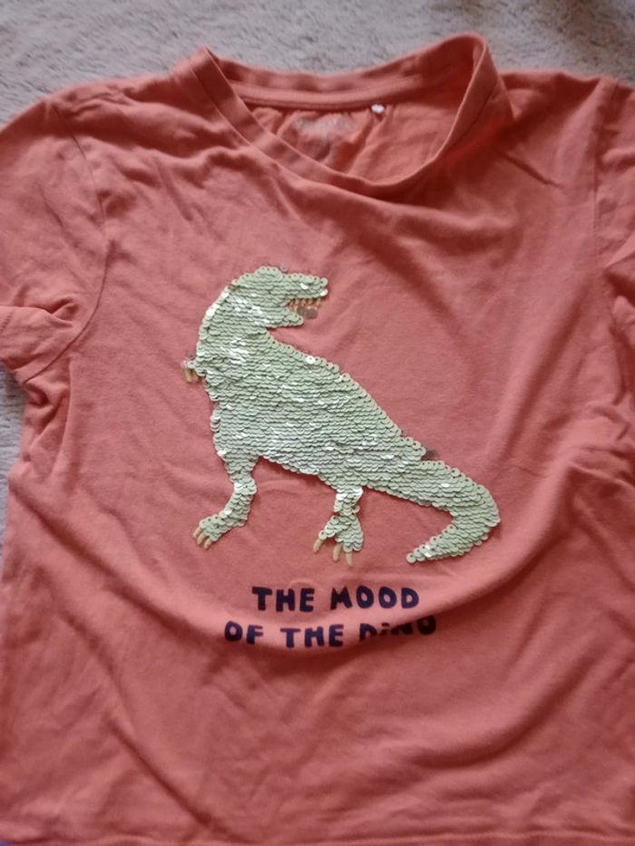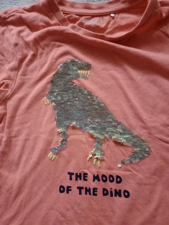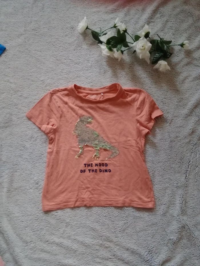 Lot composé d'un t-shirt bleu « tennis player Beach time » marque orchestra et d un t-shirt couleur corail avec dinosaure à sequins réversibles marque orchestra 🚨Pas d'envoi à moins de 2 € #carineleray_8a