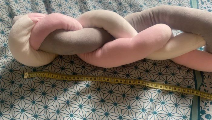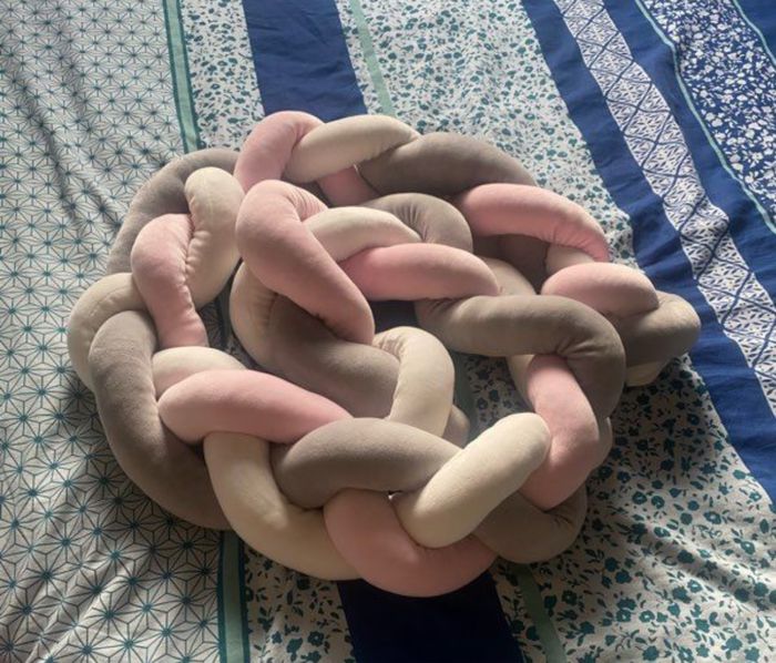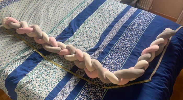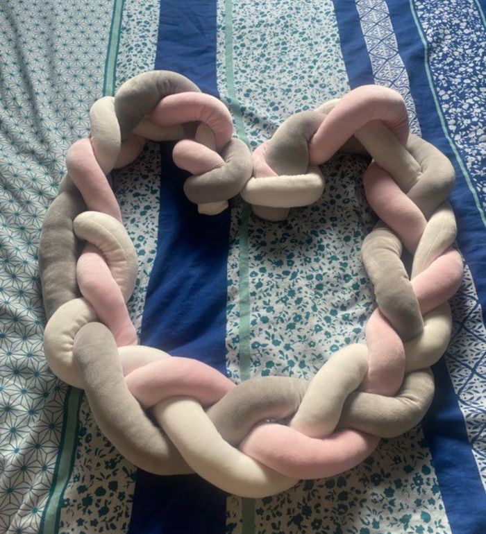 Tresse de lit bébé neuve jamais utilisé. Elle a été lavé en préparation de la chambre de bébé qui avait été annoncé comme une fille et finalement c’est un petit garçon. Elle est rose, grise et blanche. Mesure 2m.