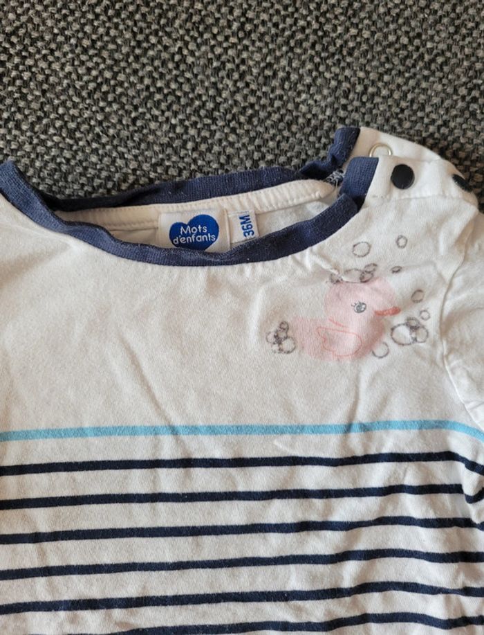 T-shirt en coton pour fille à manches longues de marque Mots d'enfants et de taille 36 mois Motif marinière à rayures avec petit canard rose et des bulles Manches élastiquées aux poignets Aucune tâche ni trou. Les bulles se sont un peu estompées aux lavages #mabi38780fille36mois