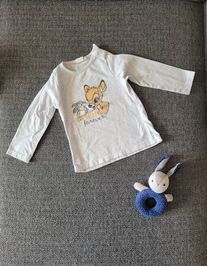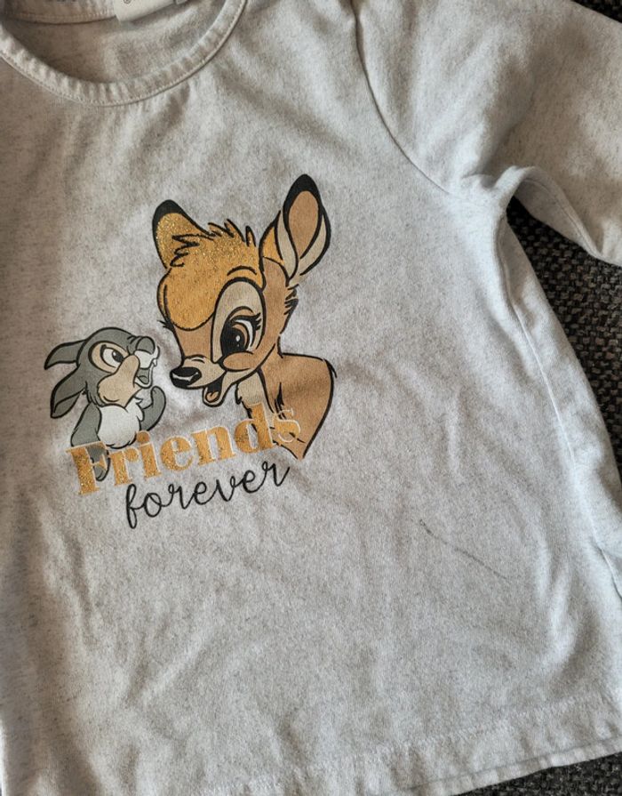 T-shirt en coton pour fille à manches longues Bambi de taille 24 mois Motif Bambi et Panpan à paillettes Aucun trou. Juste une trace de feutre noire sur le devant et les paillettes sont un peu parties (voir photos) #mabi38780fille24mois