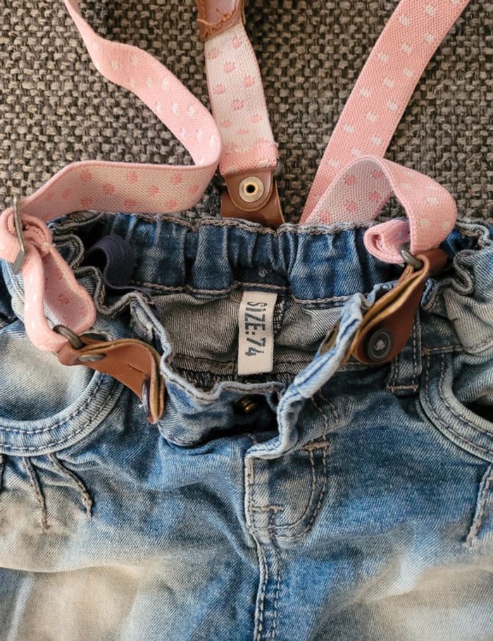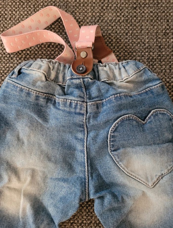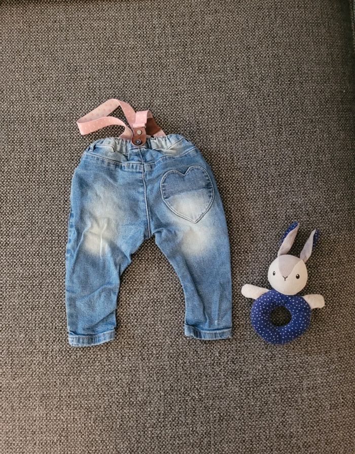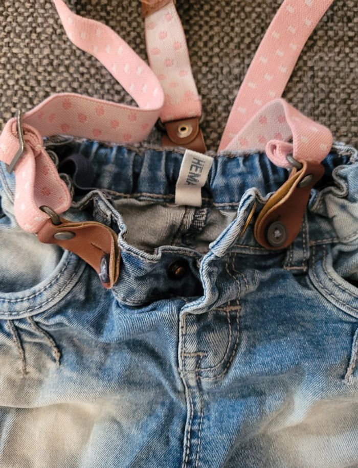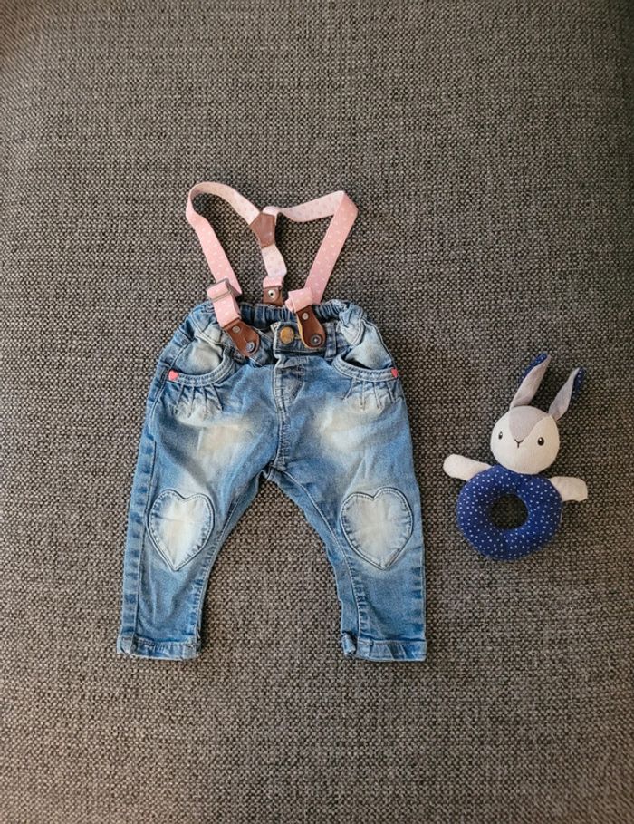 Jeans pour fille de marque Hema et de taille 9-12 mois 74 cm Girly avec empiècements en forme de cœur Taille élastiquée et ajustable Poches à l'avant et à l'arrière Effet délavé Bretelles amovibles roses (à réparer car un côté n'est plus réglable) mais font juste décoration Aucune tâche ni trou #mabi38780fille9mois #mabi38780fille12mois