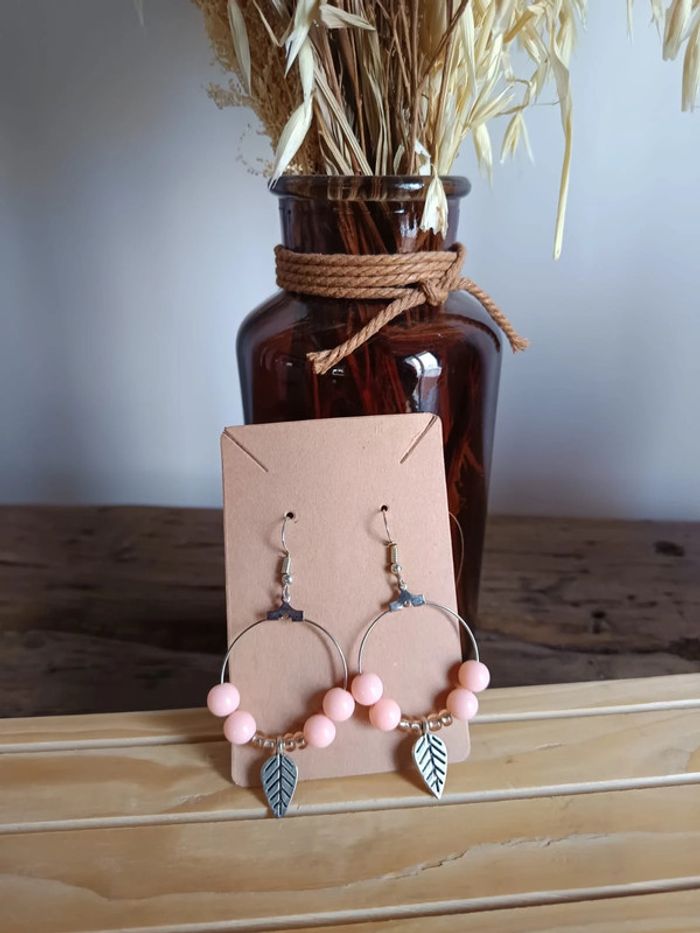 Paire de boucles d'oreilles créoles avec perles roses et apprêt feuille