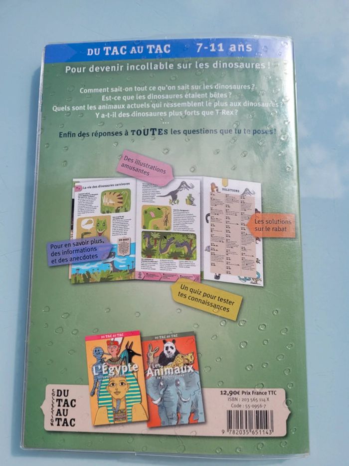 DU TAC AU TAC LES DINOSAURES EN 200 QUESTIONS Comment sait-on tout ce qu'on sait sur les dinosaures ? Est-ce que les dinosaures étaient bêtes ? Quels sont les animaux actuels qui ressemblent le plus aux dinosaures ? Y a-t-il des dinosaures plus forts que T-Rex ? Enfin des réponses à toutes les questions que tu te poses ! Dimensions 17,5 cm × 27,0 cm × 1,0 cm Très bon état Mes livres par thème : #livredinosauresmooglou Mes autres Larousse : #livrelaroussemooglou Mes autres livres enfants : #livreenfantmooglou