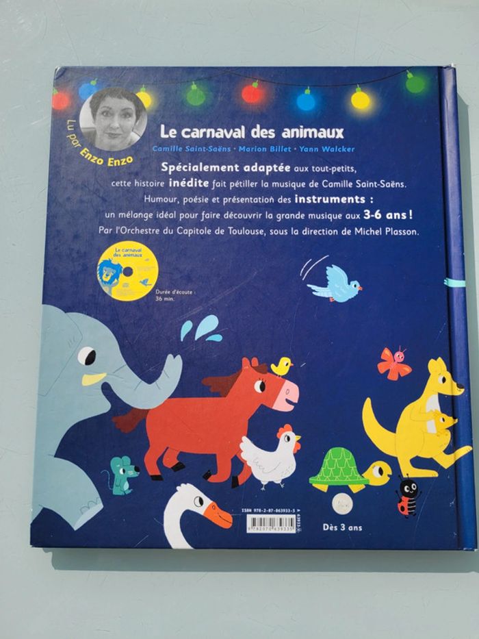 LE CARNAVAL DES ANIMAUX LIVRE AVEC CD Raconté par Enzo Enzo. Musique de Camille Saint-Saëns Contient 1 CD audio. Durée découte : 36 min 1 ou 2 petites imperfections notamment au niveau de la couverture, mais en très bon état général, le CD fonctionne parfaitement bien et a été écouté en entier pour la vente, un petit accroc sur le bas de la première page (cf dernière photo) Mes autres livres avec CD : #livrecdmooglou Mes autres livres enfants : #livreenfantmooglou