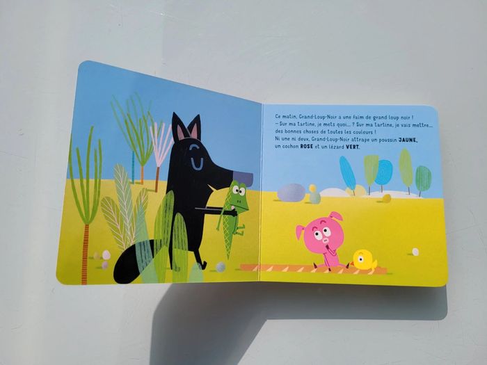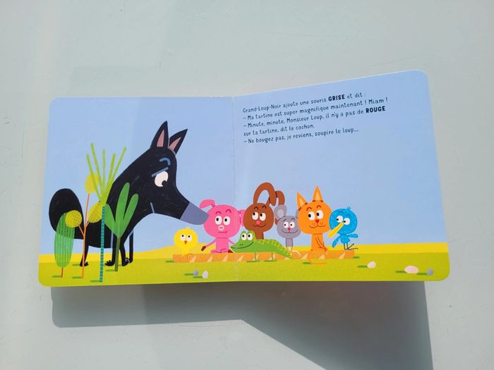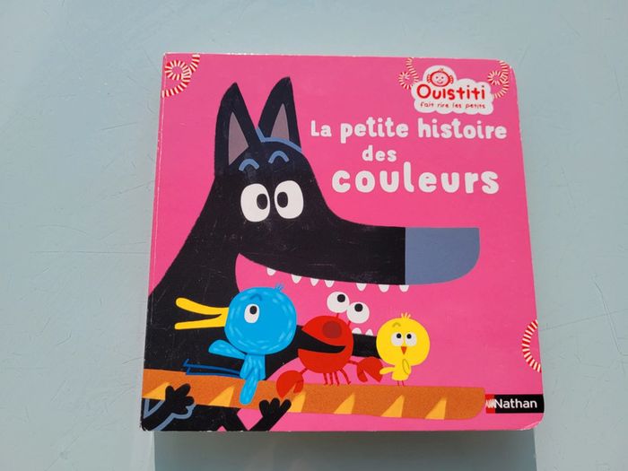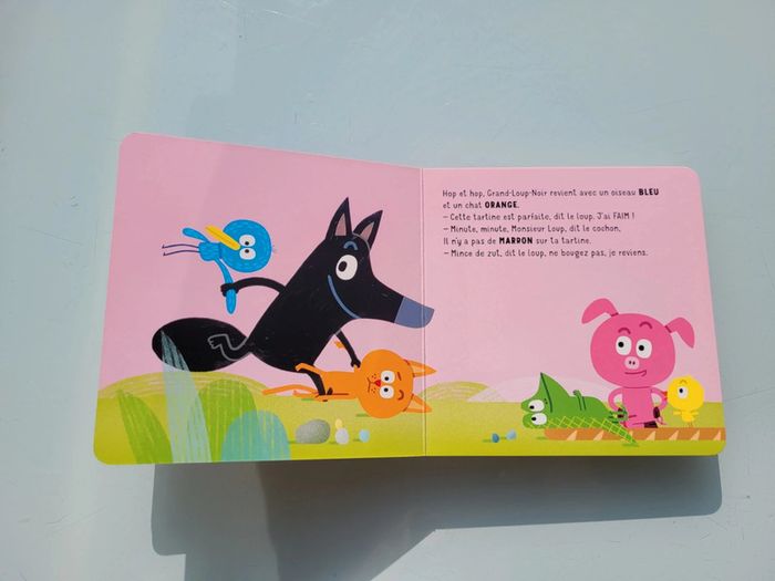 OUISTITI FAIT RIRE LES PETITS LA PETITE HISTOIRE DES COULEURS TOUT CARTON Une histoire pleine de fantaisie pour apprendre les couleurs en créant une tartine d'animaux colorés ! L'humour adapté aux bébés pour apprendre une notion clé : les couleurs. Un moment de complicité et de jeu avec son enfant. L'histoire : Grand loup noir attrape un cochon rose, une grenouille verte, un écureuil orange... à chaque fois qu'il s'apprête à croquer dans sa tartine, on lui fait remarquer qu'il manque une couleur. A la fin, alors que le loup cherche un animal violet, les animaux en profitent pour filer et lui laissent en échange une tartine végétarienne : un bonbon rose, un haricot vert, une orange orange, etc. En très bon état Mes autres livres enfants : #livreenfantmooglou