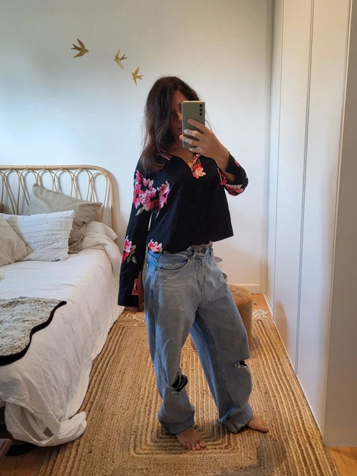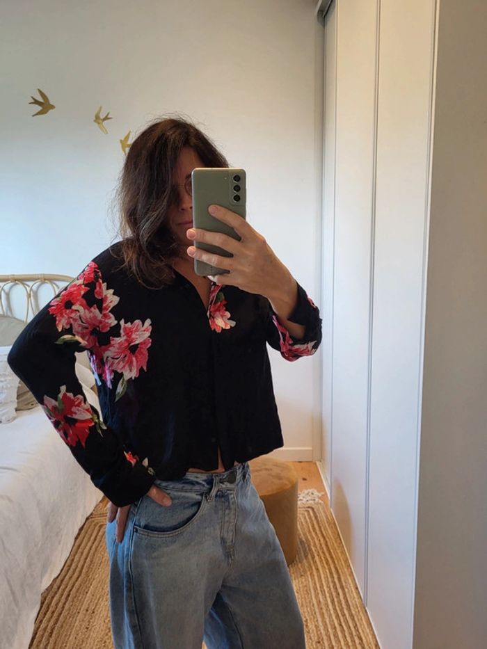 Chemise courte a manches longues. Couleur noir, motif fleur Taille 36