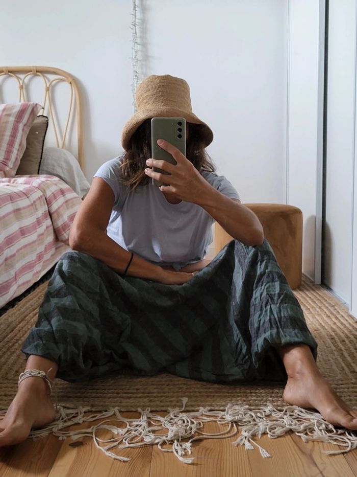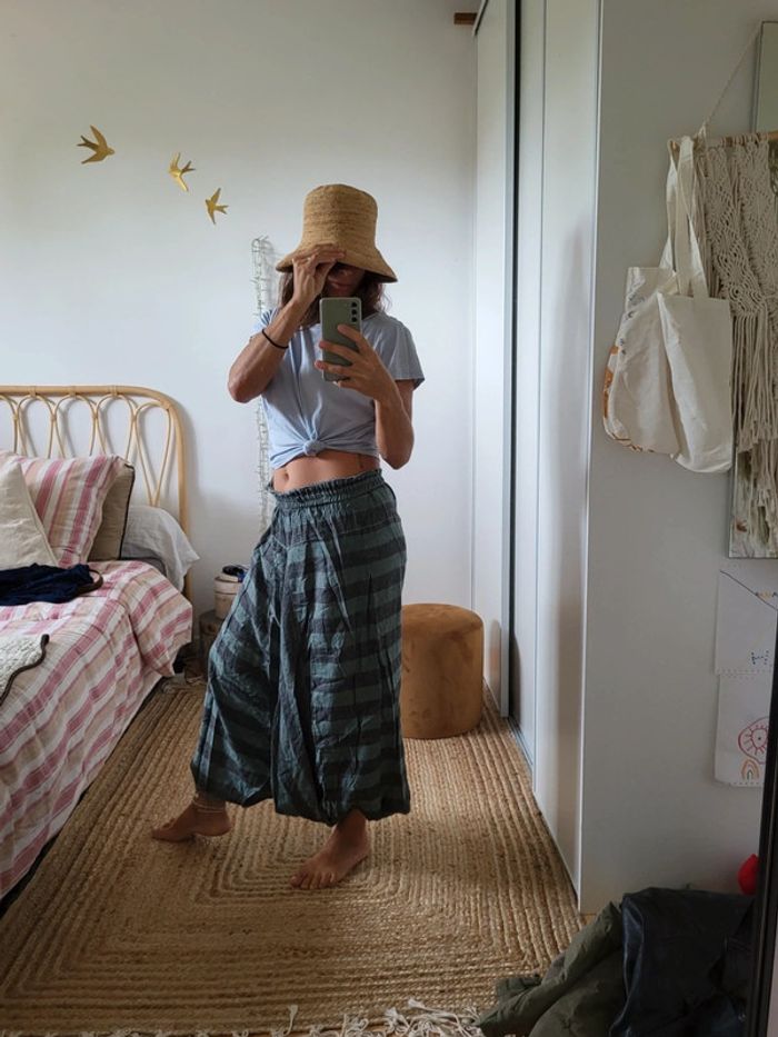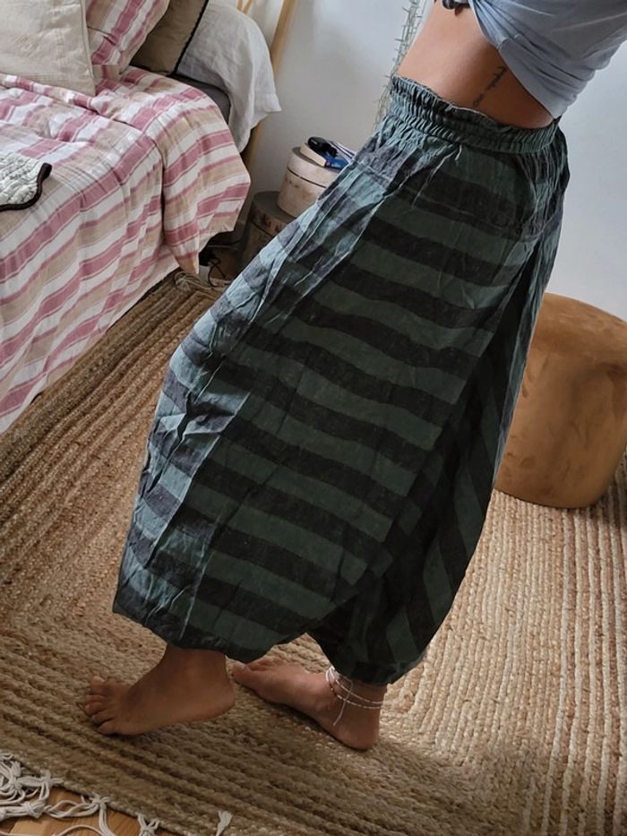 Pantalon sarouel rayé bleu et gris Ultra large Ultra confortable Taille unique. En très bon état. Acheté dans une petite boutique en Australie (marque inconnue) Fabrication 50% coton 50% hemp (chanvre)